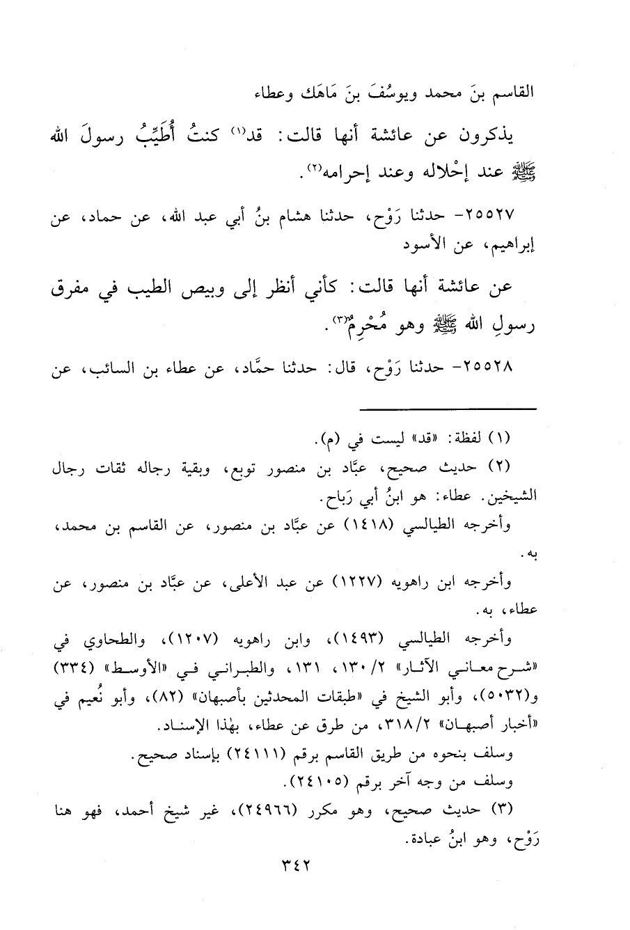 ٢٥٥٢٧ - حَدَّثَنَا رَوْحٌ، حَدَّثَنَا هِشَامُ بْنُ أَبِي عَبْدِ اللهِ، عَنْ حَمَّادٍ، عَنْ إِبْرَاهِيمَ، عَنِ الْأَسْوَدِ، عَنْ عَائِشَةَ، أَنَّهَا قَالَتْ: " كَأَنِّي أَنْظُرُ إِلَى وَبِيصِ الطِّيبِ فِي مَفْرِقِ رَسُولِ اللهِ صَلَّى اللهُ عَلَيْهِ وَسَلَّمَ وَهُوَ مُحْرِمٌ " (٣)