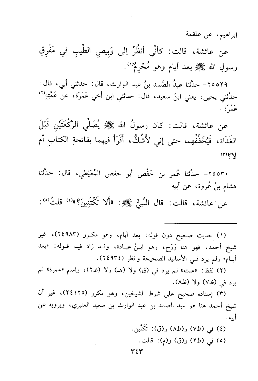 عَنْ إِبْرَاهِيمَ، عَنْ عَلْقَمَةَ، عَنْ عَائِشَةَ، قَالَتْ: " كَأَنِّي أَنْظُرُ إِلَى وَبِيصِ الطِّيبِ فِي مَفْرِقِ رَسُولِ اللهِ صَلَّى اللهُ عَلَيْهِ وَسَلَّمَ بَعْدَ أَيَّامٍ وَهُوَ مُحْرِمٌ " (١)