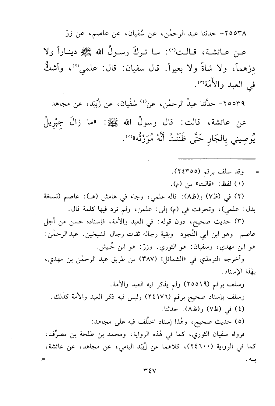 ٢٥٥٣٩ - حَدَّثَنَا عَبْدُ الرَّحْمَنِ، عَنْ (٤) سُفْيَانَ، عَنْ زُبَيْدٍ، عَنْ مُجَاهِدٍ، عَنْ عَائِشَةَ، قَالَتْ: قَالَ رَسُولُ اللهِ صَلَّى اللهُ عَلَيْهِ وَسَلَّمَ: " مَا زَالَ جِبْرِيلُ يُوصِينِي بِالْجَارِ، حَتَّى ظَنَنْتُ أَنَّهُ مُوَرِّثُهُ " (٥)