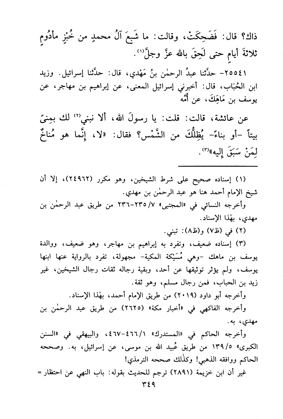 ٢٥٥٤١ - حَدَّثَنَا عَبْدُ الرَّحْمَنِ بْنُ مَهْدِيٍّ، قَالَ: حَدَّثَنَا إِسْرَائِيلُ، وَزَيْدُ بْنُ الْحُبَابِ، قَالَ: أَخْبَرَنِي إِسْرَائِيلُ الْمَعْنَى، عَنْ إِبْرَاهِيمَ بْنِ مُهَاجِرٍ، عَنْ يُوسُفَ بْنِ مَاهَكَ، عَنْ أُمِّهِ، عَنْ عَائِشَةَ، قَالَتْ: قُلْتُ يَا رَسُولَ اللهِ أَلَا نَبْنِي (٢) لَكَ بِمِنًى بَيْتًا - أَوْ بِنَاءً - يُظِلُّكَ مِنَ الشَّمْسِ؟ فَقَالَ: " لَا إِنَّمَا هُوَ مُنَاخُ لِمَنْ سَبَقَ إِلَيْهِ " (٣)