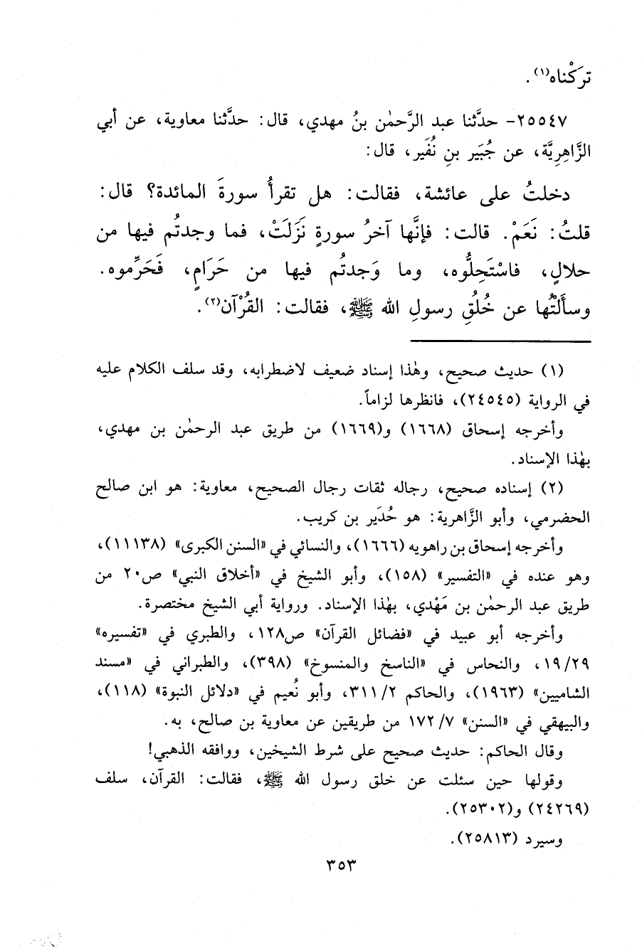 ٢٥٥٤٧ - حَدَّثَنَا عَبْدُ الرَّحْمَنِ بْنُ مَهْدِيٍّ، قَالَ: حَدَّثَنَا مُعَاوِيَةُ، عَنْ أَبِي الزَّاهِرِيَّةِ، عَنْ جُبَيْرِ بْنِ نُفَيْرٍ، قَالَ دَخَلْتُ عَلَى عَائِشَةَ فَقَالَتْ: هَلْ تَقْرَأُ سُورَةَ الْمَائِدَةِ؟ قَالَ قُلْتُ: نَعَمْ. قَالَتْ: " فَإِنَّهَا آخِرُ سُورَةٍ نَزَلَتْ فَمَا وَجَدْتُمْ فِيهَا مِنْ حَلَالٍ فَاسْتَحِلُّوهُ، وَمَا وَجَدْتُمْ فِيهَا مِنْ حَرَامٍ فَحَرِّمُوهُ "