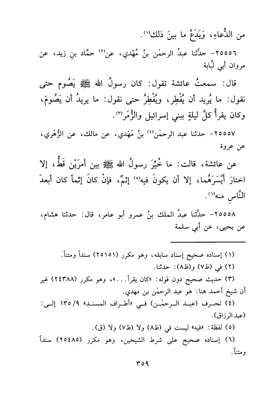 ٢٥٥٥٧ - حَدَّثَنَا عَبْدُ الرَّحْمَنِ (٤) بْنُ مَهْدِيٍّ، عَنْ مَالِكٍ، عَنِ الزُّهْرِيِّ، عَنْ عُرْوَةَ، عَنْ عَائِشَةَ، قَالَتْ: " مَا خُيِّرَ رَسُولُ اللهِ صَلَّى اللهُ عَلَيْهِ وَسَلَّمَ بَيْنَ أَمْرَيْنِ قَطُّ، إِلَّا اخْتَارَ أَيْسَرَهُمَا، إِلَّا أَنْ يَكُونَ فِيهِ (٥) إِثْمٌ، فَإِنْ كَانَ إِثْمًا كَانَ أَبْعَدَ النَّاسِ مِنْهُ " (٦)