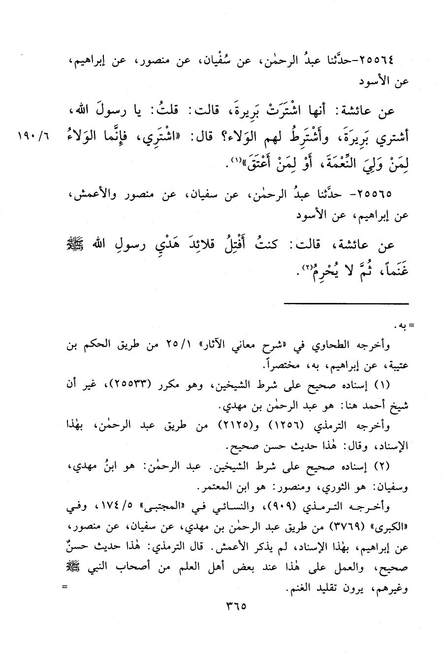 ٢٥٥٦٤ - حَدَّثَنَا عَبْدُ الرَّحْمَنِ، عَنْ سُفْيَانَ، عَنْ مَنْصُورٍ، عَنْ إِبْرَاهِيمَ، عَنِ الْأَسْوَدِ، عَنْ عَائِشَةَ، أَنَّهَا اشْتَرَتْ بَرِيرَةَ قَالَتْ قُلْتُ: يَا رَسُولَ اللهِ أَشْتَرِي بَرِيرَةَ وَأَشْتَرِطُ لَهُمُ الْوَلَاءَ؟ قَالَ: " اشْتَرِي فَإِنَّمَا الْوَلَاءُ لِمَنْ وَلِيَ النِّعْمَةَ، أَوْ لِمَنْ أَعْتَقَ " (١)