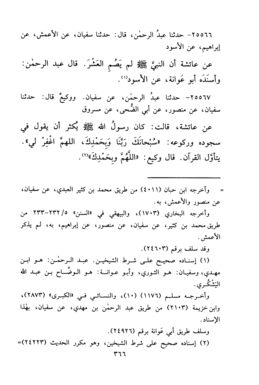 ٢٥٥٦٧ - حَدَّثَنَا عَبْدُ الرَّحْمَنِ، عَنْ سُفْيَانَ، وَوَكِيعٌ، قَالَ: حَدَّثَنَا سُفْيَانُ، عَنْ مَنْصُورٍ، عَنْ أَبِي الضُّحَى، عَنْ مَسْرُوقٍ، عَنْ عَائِشَةَ، قَالَتْ: كَانَ رَسُولُ اللهِ صَلَّى اللهُ عَلَيْهِ وَسَلَّمَ يُكْثِرُ أَنْ يَقُولَ فِي سُجُودِهِ وَرُكُوعِهِ " سُبْحَانَكَ رَبَّنَا، وَبِحَمْدِكَ، اللهُمَّ اغْفِرْ لِي "، يَتَأَوَّلُ الْقُرْآنَ قَالَ وَكِيعٌ: اللهُمَّ وَبِحَمْدِكَ (٢)