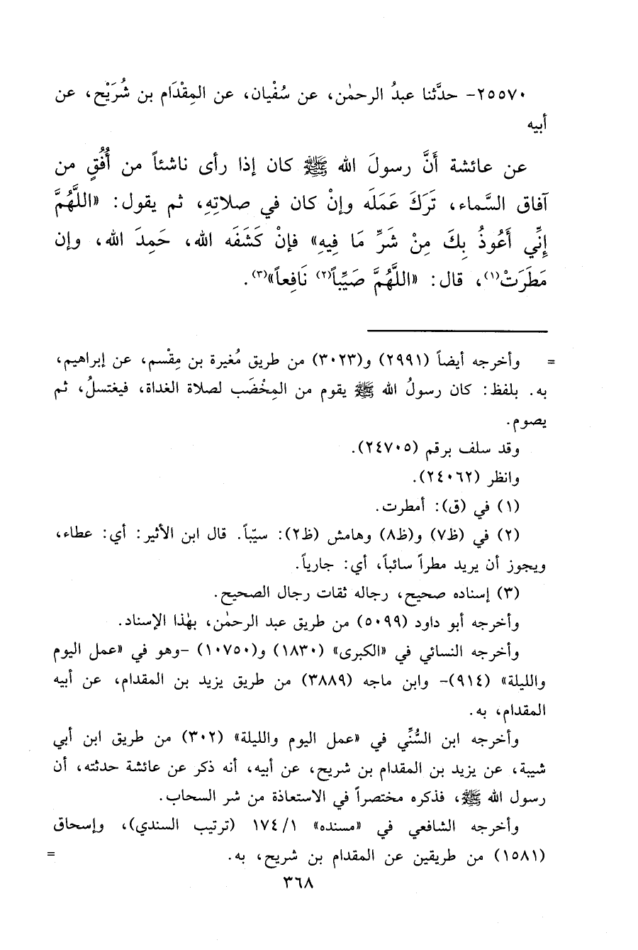 ٢٥٥٧٠ - حَدَّثَنَا عَبْدُ الرَّحْمَنِ، عَنْ سُفْيَانَ، عَنِ الْمِقْدَامِ بْنِ شُرَيْحٍ، عَنْ أَبِيهِ، عَنْ عَائِشَةَ، أَنَّ رَسُولَ اللهِ صَلَّى اللهُ عَلَيْهِ وَسَلَّمَ كَانَ إِذَا رَأَى نَاشِئًا مِنْ أُفُقٍ مِنْ آفَاقِ السَّمَاءِ، تَرَكَ عَمَلَهُ، وَإِنْ كَانَ فِي صَلَاتِهِ ثُمَّ يَقُولُ " اللهُمَّ إِنِّي أَعُوذُ بِكَ مِنْ شَرِّ مَا فِيهِ، فَإِنْ كَشَفَهُ اللهُ، حَمِدَ اللهَ، وَإِنْ مَطَرَتْ، (١) قَالَ: اللهُمَّ صَيِّبًا (٢) نَافِعًا " (٣)