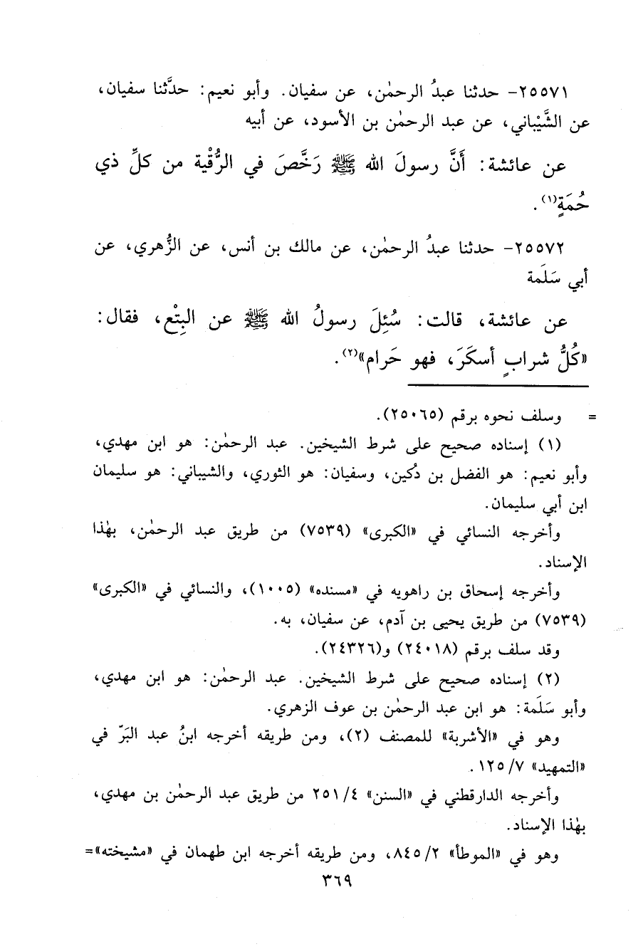 ٢٥٥٧٢ - حَدَّثَنَا عَبْدُ الرَّحْمَنِ، عَنْ مَالِكِ بْنِ أَنَسٍ، عَنِ الزُّهْرِيِّ، عَنْ أَبِي سَلَمَةَ، عَنْ عَائِشَةَ، قَالَتْ: سُئِلَ رَسُولُ اللهِ صَلَّى اللهُ عَلَيْهِ وَسَلَّمَ عَنِ الْبِتْعِ فَقَالَ: " كُلُّ شَرَابٍ أَسْكَرَ فَهُوَ حَرَامٌ " (٢)