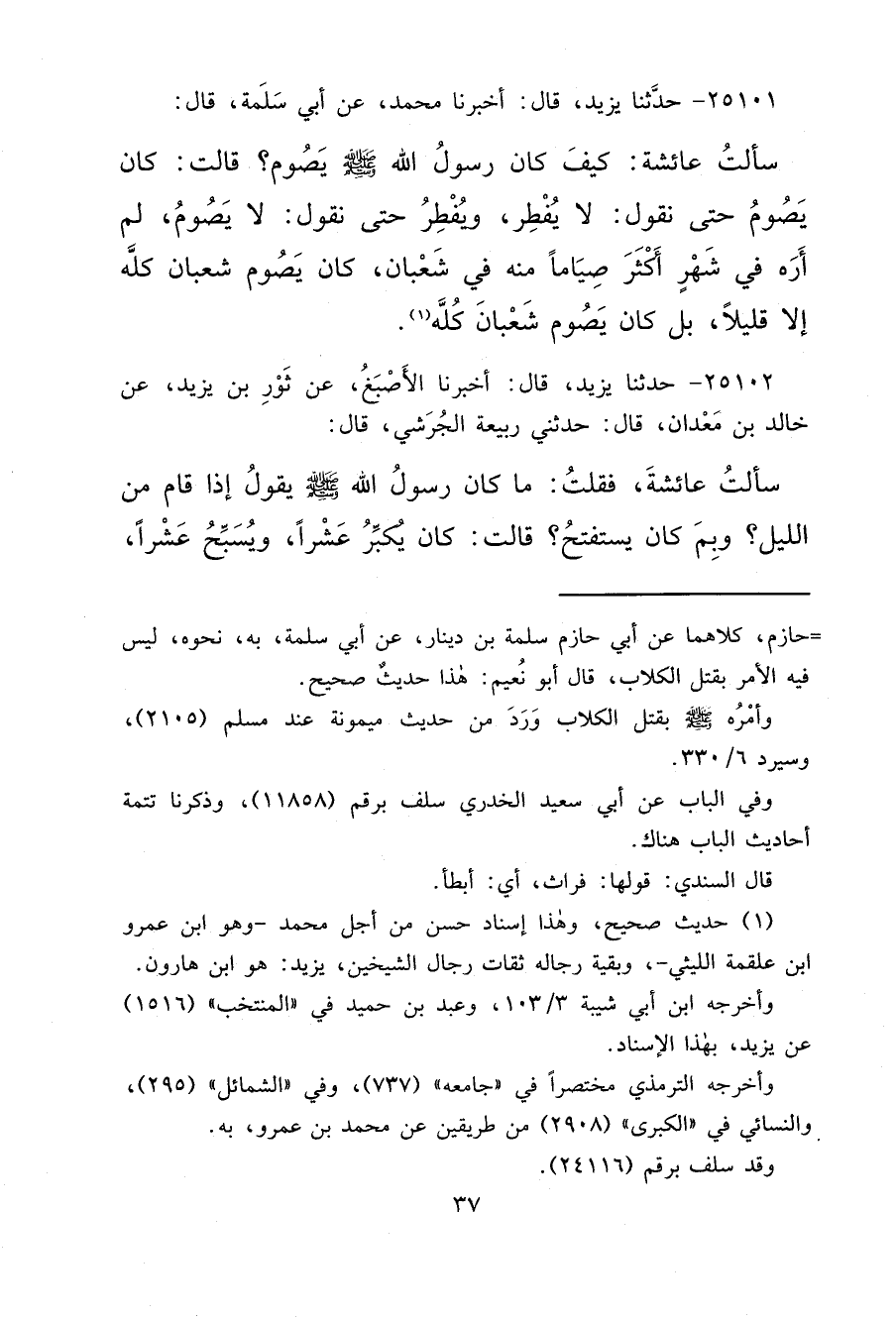 ٢٥١٠١ - حَدَّثَنَا يَزِيدُ، قَالَ: أَخْبَرَنَا مُحَمَّدٌ، عَنْ أَبِي سَلَمَةَ، قَالَ: سَأَلْتُ عَائِشَةَ: كَيْفَ كَانَ رَسُولُ اللهِ صَلَّى اللهُ عَلَيْهِ وَسَلَّمَ يَصُومُ؟ قَالَتْ: " كَانَ يَصُومُ حَتَّى نَقُولَ: لَا يُفْطِرُ، وَيُفْطِرُ حَتَّى نَقُولَ: لَا يَصُومُ، لَمْ أَرَهُ فِي شَهْرٍ أَكْثَرَ صِيَامًا مِنْهُ فِي شَعْبَانَ، كَانَ يَصُومُ شَعْبَانَ كُلَّهُ إِلَّا قَلِيلًا، بَلْ كَانَ يَصُومُ شَعْبَانَ كُلَّهُ " (١)