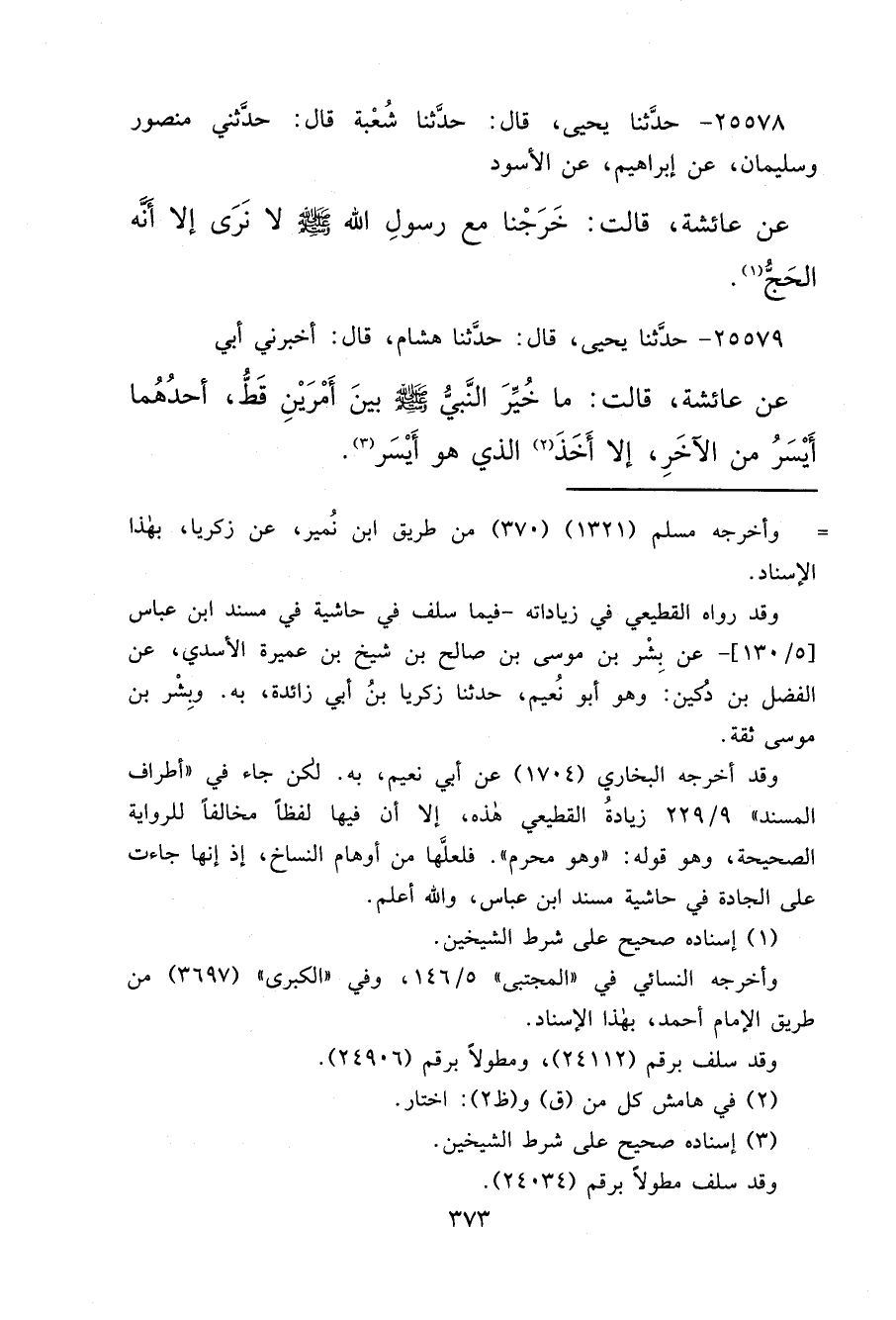 ٢٥٥٧٩ - حَدَّثَنَا يَحْيَى، قَالَ: حَدَّثَنَا هِشَامٌ، قَالَ: أَخْبَرَنِي أَبِي، عَنْ عَائِشَةَ، قَالَتْ: " مَا خُيِّرَ النَّبِيُّ صَلَّى اللهُ عَلَيْهِ وَسَلَّمَ بَيْنَ أَمْرَيْنِ قَطُّ، أَحَدُهُمَا أَيْسَرُ مِنَ الْآخَرِ، إِلَّا أَخَذَ (٢) الَّذِي هُوَ أَيْسَرُ " (٣)