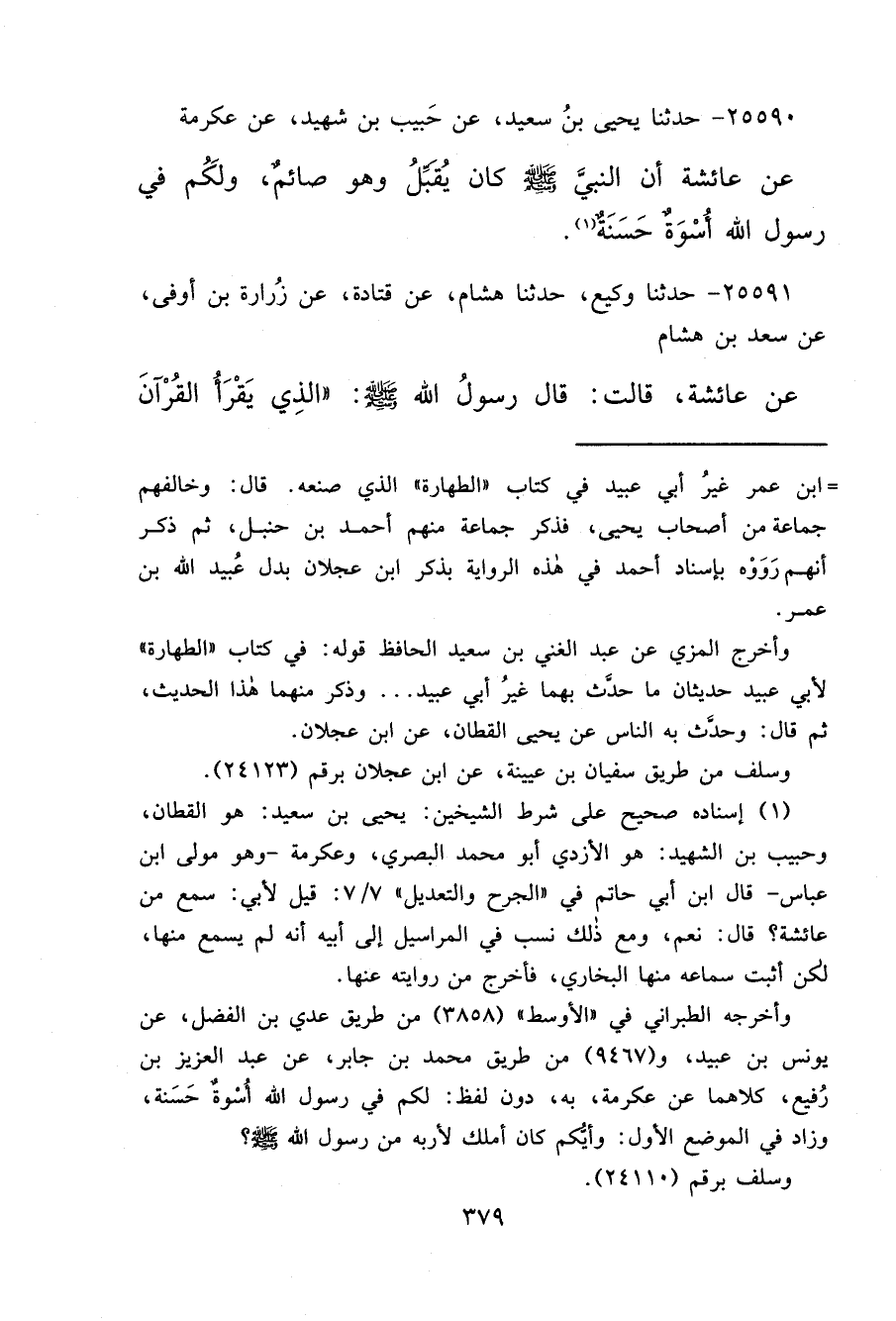 ٢٥٥٩٠ - حَدَّثَنَا يَحْيَى بْنُ سَعِيدٍ، عَنْ حَبِيبِ بْنِ شَهِيدٍ، عَنْ عِكْرِمَةَ، عَنْ عَائِشَةَ، أَنَّ النَّبِيَّ صَلَّى اللهُ عَلَيْهِ وَسَلَّمَ كَانَ " يُقَبِّلُ وَهُوَ صَائِمٌ، وَلَكُمْ فِي رَسُولِ اللهِ أُسْوَةٌ حَسَنَةٌ " (١)