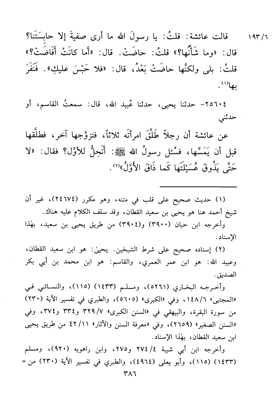 ٢٥٦٠٤ - حَدَّثَنَا يَحْيَى، حَدَّثَنَا عُبَيْدِ اللهِ، قَالَ: سَمِعْتُ الْقَاسِمَ، أَوْ حَدَّثَنِي عَنْ عَائِشَةَ، أَنَّ رَجُلًا طَلَّقَ امْرَأَتَهُ ثَلَاثًا، فَتَزَوَّجَهَا آخَرُ فَطَلَّقَهَا قَبْلَ أَنْ يَمَسَّهَا، فَسُئِلَ رَسُولُ اللهِ صَلَّى اللهُ عَلَيْهِ وَسَلَّمَ: أَتَحِلُّ لِلْأَوَّلِ؟ فَقَالَ: " لَا حَتَّى يَذُوقَ عُسَيْلَتَهَا كَمَا ذَاقَ الْأَوَّلُ " (٢)