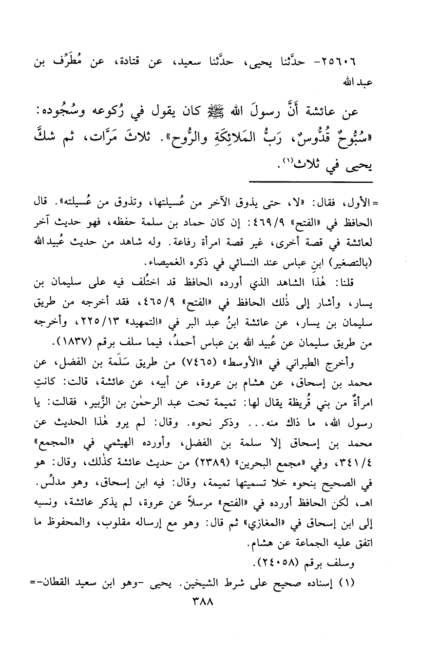 ٢٥٦٠٦ - حَدَّثَنَا يَحْيَى، حَدَّثَنَا سَعِيدٌ، عَنْ قَتَادَةَ، عَنْ مُطَرِّفِ بْنِ عَبْدِ اللهِ، عَنْ عَائِشَةَ أَنَّ رَسُولَ اللهِ صَلَّى اللهُ عَلَيْهِ وَسَلَّمَ كَانَ يَقُولُ فِي رُكُوعِهِ وَسُجُودِهِ: " سُبُّوحٌ قُدُّوسٌ، رَبُّ الْمَلَائِكَةِ وَالرُّوحِ، ثَلَاثَ مَرَّاتٍ " ثُمَّ شَكَّ يَحْيَى فِي ثَلَاثٍ (١)