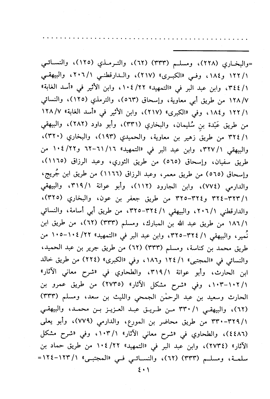 =والبخاري (٢٢٨) ، ومسلم (٣٣٣) (٦٢) ، والترمذي (١٢٥) ، والنسائي ١/ ١٢٢ و١٨٤، وفي "الكبرى" (٢١٧) ، والدارقطني ١/٢٠٦، والبيهقي ١/٣٤٤، وابن عبد البر في "التمهيد" ٢٢/١٠٤، وابن الأثير في "أسد الغابة" ٧/١٢٨ من طريق أبي معاوية، وإسحاق (٥٦٣) ، والترمذي (١٢٥) ، والنسائي ١/١٢٢ و١٨٤، وفي "الكبرى" (٢١٧) ، وابن الأثير في "أسد الغابة" ٧/١٢٨ من طريق عَبْدة بنِ سُليمان، والبخاري (٣٣١) ، وأبو داود (٢٨٢) ، والبيهقي ١/٣٢٤ من طريق زهير بن معاوية، والحميدي (١٩٣) ، والبخاري (٣٢٠) ، والبيهقي ١/٣٢٧، وابن عبد البر في "التمهيد" ١٦/٦١-٦٢ و٢٢/١٠٤ من طريق سفيان، وإسحاق (٥٦٥) من طريق الثوري، وعبد الرزاق (١١٦٥) ، وإسحاق (٥٦٥) من طريق معمر، وعبد الرزاق (١١٦٦) من طريق ابن جُريج، والدارمي (٧٧٤) ، وابن الجارود (١١٢) ، وأبو عوانة ١/٣١٩، والبيهقي ١/٣٢٣-٣٢٤ و٣٢٤-٣٢٥ من طريق جعفر بن عون، والبخاري (٣٢٥) ، والدارقطني ١/٢٠٦، والبيهقي ١/٣٢٤- ٣٢٥، من طريق أبي أسامة، والنسائي ١/٨٦ من طريق عبد الله بن المبارك، ومسلم (٣٣٣) (٦٢) ، من طريق ابن نُمير، والبيهقي ١/٣٢٤-٣٢٥، وابن عبد البر في "التمهيد" ٢٢/١٠٤-١٠٥ من طريق محمد بن كناسة، ومسلم (٣٣٣) (٦٢) من طريق جرير بن عبد الحميد، والنسائي في "المجتبى" ١/١٢٤ و١٨٦، وفي "الكبرى" (٢٢٤) من طريق خالد ابن الحارث، وأبو عوانة ١/٣١٩، والطحاوي في "شرح معاني الآثار" ١/١٠٢-١٠٣، وفي "شرح مشكل الآثار" (٢٧٣٥) من طريق عمرو بن
