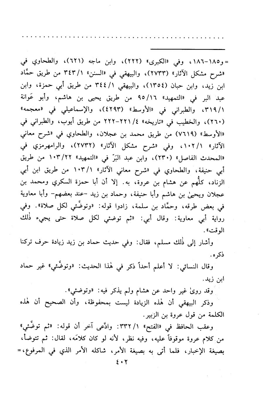 وقال النسائي: لا أعلم أحداً ذكر في هذا الحديث: "وتوضَّئي" غير حماد ابن زيد.
