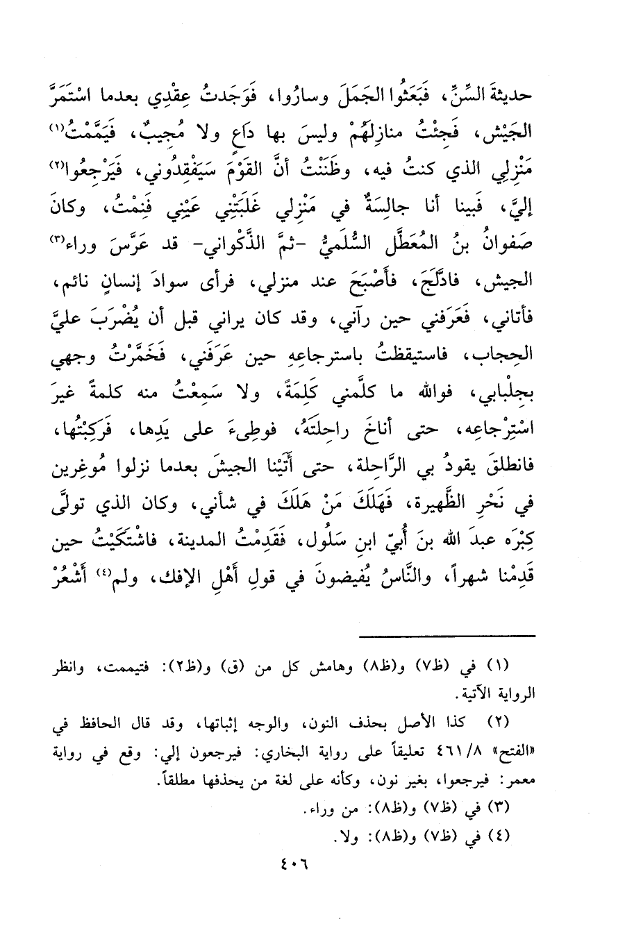 حَدِيثَةَ السِّنِّ فَبَعَثُوا الْجَمَلَ، وَسَارُوا، فَوَجَدْتُ عِقْدِي بَعْدَمَا اسْتَمَرَّ الْجَيْشُ، فَجِئْتُ مَنَازِلَهُمْ وَلَيْسَ بِهَا دَاعٍ وَلَا مُجِيبٌ، فَيَمَّمْتُ (١) مَنْزِلِي الَّذِي كُنْتُ فِيهِ، وَظَنَنْتُ أَنَّ الْقَوْمَ سَيَفْقِدُونِي، فَيَرْجِعُوا (٢) إِلَيَّ فَبَيْنَمَا أَنَا جَالِسَةٌ فِي مَنْزِلِي، غَلَبَتْنِي عَيْنِي فَنِمْتُ، وَكَانَ صَفْوَانُ بْنُ الْمُعَطَّلِ السُّلَمِيُّ ثُمَّ الذَّكْوَانِيُّ قَدْ عَرَّسَ وَرَاءَ (٣) الْجَيْشِ، فَأَدْلَجَ فَأَصْبَحَ عِنْدَ مَنْزِلِي، فَرَأَى سَوَادَ إِنْسَانٍ نَائِمٍ، فَأَتَانِي فَعَرَفَنِي حِينَ رَآنِي، وَقَدْ كَانَ يَرَانِي قَبْلَ أَنْ يُضْرَبَ عَلَيَّ الْحِجَابُ، فَاسْتَيْقَظْتُ بِاسْتِرْجَاعِهِ حِينَ عَرَفَنِي، فَخَمَّرْتُ وَجْهِي بِجِلْبَابِي، فَوَاللهِ مَا كَلَّمَنِي كَلِمَةً، وَلَا سَمِعْتُ مِنْهُ كَلِمَةً غَيْرَ اسْتِرْجَاعِهِ حَتَّى أَنَاخَ رَاحِلَتَهُ، فَوَطِئَ عَلَى يَدِهَا، فَرَكِبْتُهَا فَانْطَلَقَ يَقُودُ بِي الرَّاحِلَةَ، حَتَّى أَتَيْنَا الْجَيْشَ بَعْدَمَا نَزَلُوا مُوغِرِينَ فِي نَحْرِ الظَّهِيرَةِ، فَهَلَكَ مَنْ هَلَكَ فِي شَأْنِي، وَكَانَ الَّذِي تَوَلَّى كِبْرَهُ عَبْدُ اللهِ بْنُ أُبَيِّ ابْنِ سَلُولَ، فَقَدِمْتُ الْمَدِينَةَ فَاشْتَكَيْتُ حِينَ قَدِمْنَا شَهْرًا، وَالنَّاسُ يُفِيضُونَ فِي قَوْلِ أَهْلِ الْإِفْكِ، وَلَمْ (٤) أَشْعُرْ