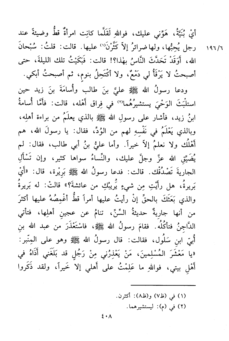 أَيْ بُنَيَّةُ هَوِّنِي عَلَيْكِ، فَوَاللهِ لَقَلَّمَا كَانَتْ امْرَأَةٌ قَطُّ وَضِيئَةً عِنْدَ رَجُلٍ يُحِبُّهَا، وَلَهَا ضَرَائِرُ إِلَّا كَثَّرْنَ (١) عَلَيْهَا، قَالَتْ قُلْتُ: سُبْحَانَ اللهِ أَوَقَدْ تَحَدَّثَ النَّاسُ بِهَذَا؟ قَالَتْ: فَبَكَيْتُ تِلْكَ اللَّيْلَةَ حَتَّى أَصْبَحْتُ، لَا يَرْقَأُ لِي دَمْعٌ، وَلَا أَكْتَحِلُ بِنَوْمٍ، ثُمَّ أَصْبَحْتُ أَبْكِي، وَدَعَا رَسُولُ اللهِ صَلَّى اللهُ عَلَيْهِ وَسَلَّمَ عَلِيَّ بْنَ أَبِي طَالِبٍ، وَأُسَامَةَ بْنَ زَيْدٍ حِينَ اسْتَلْبَثَ الْوَحْيُ يَسْتَشِيرُهُمَا (٢) فِي فِرَاقِ أَهْلِهِ، قَالَتْ: فَأَمَّا أُسَامَةُ بْنُ زَيْدٍ فَأَشَارَ عَلَى رَسُولِ اللهِ صَلَّى اللهُ عَلَيْهِ وَسَلَّمَ بِالَّذِي يَعْلَمُ مِنْ بَرَاءَةِ أَهْلِهِ، وَبِالَّذِي يَعْلَمُ فِي نَفْسِهِ لَهُمْ مِنَ الْوُدِّ، فَقَالَ: يَا رَسُولَ اللهِ هُمْ أَهْلُكَ، وَلَا نَعْلَمُ إِلَّا خَيْرًا، وَأَمَّا عَلِيُّ بْنُ أَبِي طَالِبٍ فَقَالَ: لَمْ يُضَيِّقِ اللهُ عَزَّ وَجَلَّ عَلَيْكَ، وَالنِّسَاءُ سِوَاهَا كَثِيرٌ، وَإِنْ تَسْأَلِ الْجَارِيَةَ تَصْدُقْكَ، قَالَتْ فَدَعَا رَسُولُ اللهِ صَلَّى اللهُ عَلَيْهِ وَسَلَّمَ بَرِيرَةَ، قَالَ: أَيْ بَرِيرَةُ هَلْ رَأَيْتِ مِنْ شَيْءٍ يَرِيبُكِ مِنْ عَائِشَةَ؟ قَالَتْ لَهُ بَرِيرَةُ: وَالَّذِي بَعَثَكَ بِالْحَقِّ إِنْ رَأَيْتُ عَلَيْهَا أَمْرًا قَطُّ أَغْمِصُهُ عَلَيْهَا أَكْثَرَ مِنْ أَنَّهَا جَارِيَةٌ حَدِيثَةُ السِّنِّ، تَنَامُ عَنْ عَجِينِ أَهْلِهَا، فَتَأْتِي الدَّاجِنُ فَتَأْكُلُهُ، فَقَامَ رَسُولُ اللهِ صَلَّى اللهُ عَلَيْهِ وَسَلَّمَ فَاسْتَعْذَرَ مِنْ عَبْدِ اللهِ بْنِ أُبَيٍّ ابْنِ سَلُولَ فَقَالَتْ قَالَ رَسُولُ اللهِ صَلَّى اللهُ عَلَيْهِ وَسَلَّمَ وَهُوَ عَلَى الْمِنْبَرِ: " يَا مَعْشَرَ الْمُسْلِمِينَ، مَنْ يَعْذِرُنِي مِنْ رَجُلٍ قَدْ بَلَغَنِي أَذَاهُ فِي أَهْلِ بَيْتِي، فَوَاللهِ مَا عَلِمْتُ عَلَى أَهْلِي إِلَّا خَيْرًا، وَلَقَدْ ذَكَرُوا