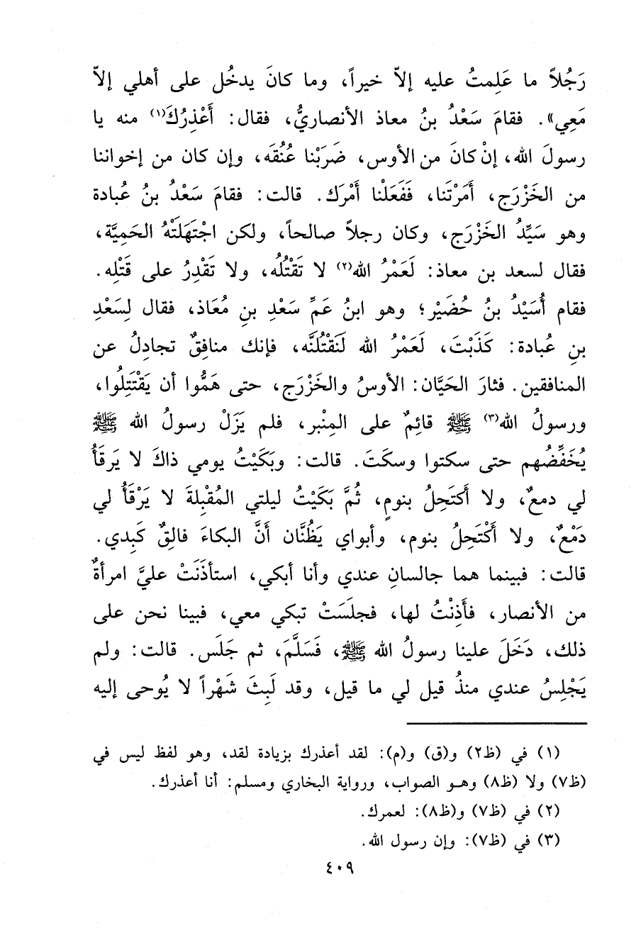 رَجُلًا مَا عَلِمْتُ عَلَيْهِ إِلَّا خَيْرًا، وَمَا كَانَ يَدْخُلُ عَلَى أَهْلِي إِلَّا مَعِي "، فَقَامَ سَعْدُ بْنُ مُعَاذٍ الْأَنْصَارِيُّ فَقَالَ: أَعْذِرُكَ (١) مِنْهُ يَا رَسُولَ اللهِ؟ إِنْ كَانَ مِنَ الْأَوْسِ ضَرَبْنَا عُنُقَهُ، وَإِنْ كَانَ مِنْ إِخْوَانِنَا مِنَ الْخَزْرَجِ أَمَرْتَنَا فَفَعَلْنَا أَمْرَكَ، قَالَتْ: فَقَامَ سَعْدُ بْنُ عُبَادَةَ وَهُوَ سَيِّدُ الْخَزْرَجِ، وَكَانَ رَجُلًا صَالِحًا، وَلَكِنْ اجْتَهَلَتْهُ الْحَمِيَّةُ، فَقَالَ لِسَعْدِ بْنِ مُعَاذٍ: لَعَمْرُ اللهِ (٢) لَا تَقْتُلُهُ، وَلَا تَقْدِرُ عَلَى قَتْلِهِ، فَقَامَ أُسَيْدُ بْنُ حُضَيْرٍ، وَهُوَ ابْنُ عَمِّ سَعْدِ بْنِ مُعَاذٍ، فَقَالَ لِسَعْدِ بْنِ عُبَادَةَ: كَذَبْتَ لَعَمْرُ اللهِ لَنَقْتُلَنَّهُ فَإِنَّكَ مُنَافِقٌ تُجَادِلُ عَنِ الْمُنَافِقِينَ، فَثَارَ الْحَيَّانِ الْأَوْسُ وَالْخَزْرَجُ، حَتَّى هَمُّوا أَنْ يَقْتَتِلُوا وَرَسُولُ اللهِ (٣) صَلَّى اللهُ عَلَيْهِ وَسَلَّمَ قَائِمٌ عَلَى الْمِنْبَرِ، فَلَمْ يَزَلْ رَسُولُ اللهِ صَلَّى اللهُ عَلَيْهِ وَسَلَّمَ يُخَفِّضُهُمْ حَتَّى سَكَتُوا، وَسَكَتَ. قَالَتْ: وَبَكَيْتُ يَوْمِي ذَاكَ لَا يَرْقَأُ لِي دَمْعٌ، وَلَا أَكْتَحِلُ بِنَوْمٍ، ثُمَّ بَكَيْتُ لَيْلَتِي الْمُقْبِلَةَ لَا يَرْقَأُ لِي دَمْعٌ، وَلَا أَكْتَحِلُ بِنَوْمٍ، وَأَبَوَايَ يَظُنَّانِ أَنَّ الْبُكَاءَ فَالِقٌ كَبِدِي، قَالَتْ: فَبَيْنَمَا هُمَا جَالِسَانِ عِنْدِي، وَأَنَا أَبْكِي، اسْتَأْذَنَتْ عَلَيَّ امْرَأَةٌ مِنَ الْأَنْصَارِ، فَأَذِنْتُ لَهَا فَجَلَسَتْ تَبْكِي مَعِي، فَبَيْنَمَا نَحْنُ عَلَى ذَلِكَ، دَخَلَ عَلَيْنَا رَسُولُ اللهِ صَلَّى اللهُ عَلَيْهِ وَسَلَّمَ فَسَلَّمَ، ثُمَّ جَلَسَ، قَالَتْ: وَلَمْ يَجْلِسْ عِنْدِي مُنْذُ قِيلَ لِي مَا قِيلَ، وَقَدْ لَبِثَ شَهْرًا لَا يُوحَى إِلَيْهِ