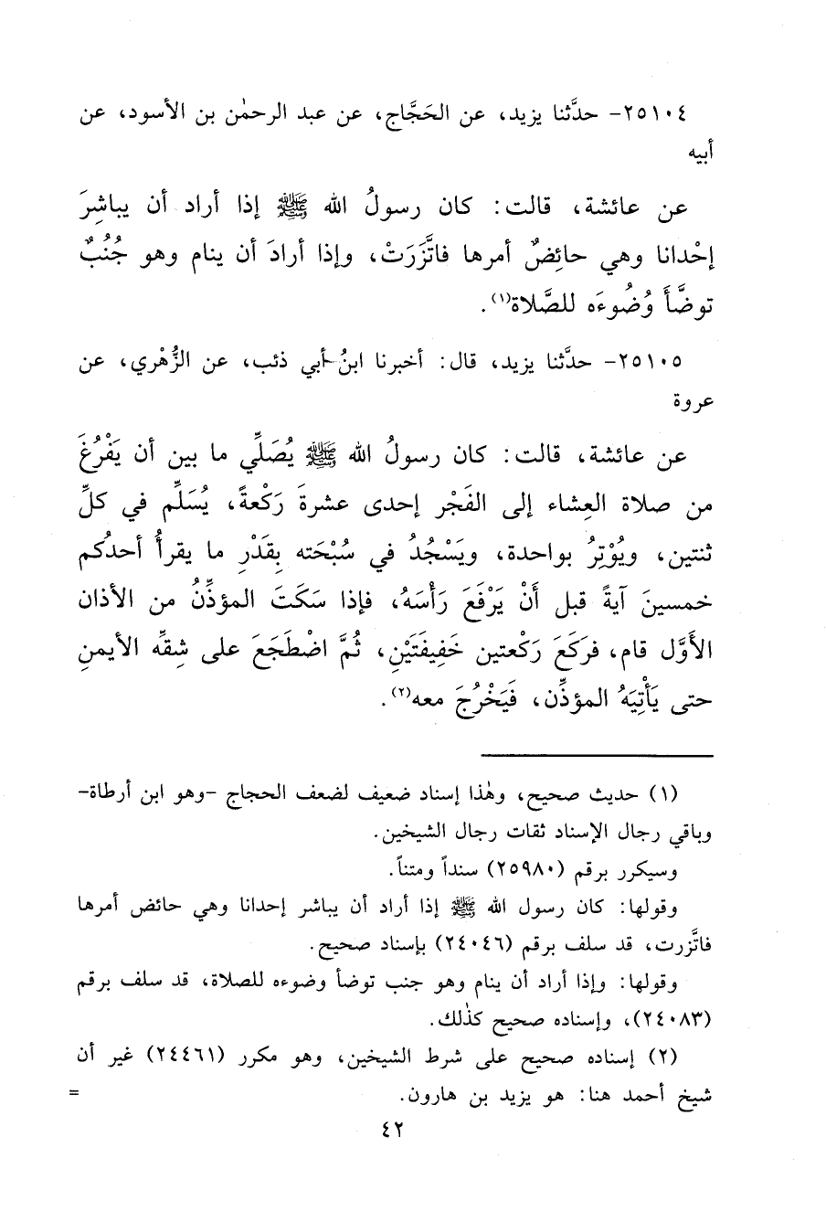 ٢٥١٠٤ - حَدَّثَنَا يَزِيدُ، عَنِ الْحَجَّاجِ، عَنْ عَبْدِ الرَّحْمَنِ بْنِ الْأَسْوَدِ، عَنْ أَبِيهِ، عَنْ عَائِشَةَ، قَالَتْ: " كَانَ رَسُولُ اللهِ صَلَّى اللهُ عَلَيْهِ وَسَلَّمَ إِذَا أَرَادَ أَنْ يُبَاشِرَ إِحْدَانَا وَهِيَ حَائِضٌ أَمَرَهَا فَاتَّزَرَتْ، وَإِذَا أَرَادَ أَنْ يَنَامَ وَهُوَ جُنُبٌ تَوَضَّأَ وُضُوءَهُ لِلصَّلَاةِ " (١)