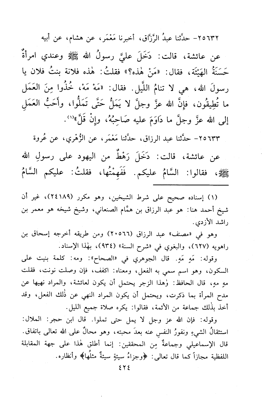٢٥٦٣٢ - حَدَّثَنَا عَبْدُ الرَّزَّاقِ، أَخْبَرَنَا مَعْمَرٌ، عَنْ هِشَامٍ، عَنْ أَبِيهِ، عَنْ عَائِشَةَ قَالَتْ: دَخَلَ عَلَيَّ رَسُولُ اللهِ صَلَّى اللهُ عَلَيْهِ وَسَلَّمَ، وَعِنْدِي امْرَأَةٌ حَسَنَةُ الْهَيْئَةِ، فَقَالَ: مَنْ هَذِهِ؟ فَقُلْتُ: هَذِهِ فُلَانَةُ بِنْتُ فُلَانٍ يَا رَسُولَ اللهِ، هِيَ لَا تَنَامُ اللَّيْلَ فَقَالَ: " مَهْ مَهْ خُذُوا مِنَ الْعَمَلِ مَا تُطِيقُونَ، فَإِنَّ اللهَ عَزَّ وَجَلَّ لَا يَمَلُّ حَتَّى تَمَلُّوا، وَأَحَبُّ الْعَمَلِ إِلَى اللهِ عَزَّ وَجَلَّ مَا دَاوَمَ عَلَيْهِ صَاحِبُهُ وَإِنْ قَلَّ " (١)