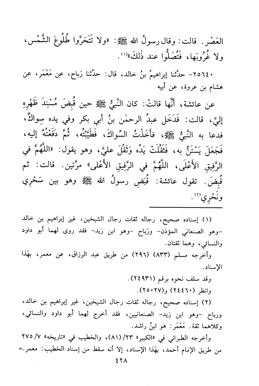 ٢٥٦٤٠ - حَدَّثَنَا إِبْرَاهِيمُ بْنُ خَالِدٍ، قَالَ: حَدَّثَنَا رَبَاحٌ، عَنْ مَعْمَرٍ، عَنْ هِشَامِ بْنِ عُرْوَةَ، عَنْ أَبِيهِ، عَنْ عَائِشَةَ أَنَّهَا قَالَتْ: كَانَ النَّبِيُّ صَلَّى اللهُ عَلَيْهِ وَسَلَّمَ حِينَ قُبِضَ مُسْنِدٌ ظَهْرَهُ إِلَيَّ، قَالَتْ: فَدَخَلَ عَبْدُ الرَّحْمَنِ بْنُ أَبِي بَكْرٍ، وَفِي يَدِهِ سِوَاكٌ، فَدَعَا بِهِ النَّبِيُّ صَلَّى اللهُ عَلَيْهِ وَسَلَّمَ، فَأَخَذْتُ السِّوَاكَ فَطَيَّبْتُهُ، ثُمَّ دَفَعْتُهُ إِلَيْهِ، فَجَعَلَ يَسْتَنُّ بِهِ، فَثَقُلَتْ يَدُهُ وَثَقُلَ عَلَيَّ، وَهُوَ يَقُولُ: " اللهُمَّ فِي الرَّفِيقِ الْأَعْلَى، اللهُمَّ فِي الرَّفِيقِ الْأَعْلَى، مَرَّتَيْنِ " قَالَتْ: ثُمَّ قُبِضَ "