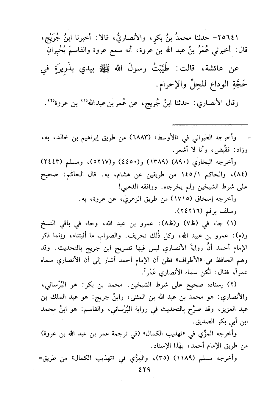 ٢٥٦٤١ - حَدَّثَنَا مُحَمَّدُ بْنُ بَكْرٍ، وَالْأَنْصَارِيُّ، قَالَا أَخْبَرَنَا ابْنُ جُرَيْجٍ، قَالَ: أَخْبَرَنِي عُمَرُ بْنُ عَبْدِ اللهِ بْنِ عُرْوَةَ، أَنَّهُ سَمِعَ عُرْوَةَ، وَالْقَاسِمَ، يُخْبِرَانِ عَنْ عَائِشَةَ، قَالَتْ: " طَيَّبْتُ رَسُولَ اللهِ صَلَّى اللهُ عَلَيْهِ وَسَلَّمَ بِيَدِي بِذَرِيرَةٍ فِي حَجَّةِ الْوَدَاعِ لِلْحِلِّ وَالْإِحْرَامِ " وَقَالَ الْأَنْصَارِيُّ حَدَّثَنَا ابْنُ جُرَيْجٍ عَنْ عُمَرَ بْنِ عَبْدِ اللهِ (١) بْنِ عُرْوَةَ (٢)
