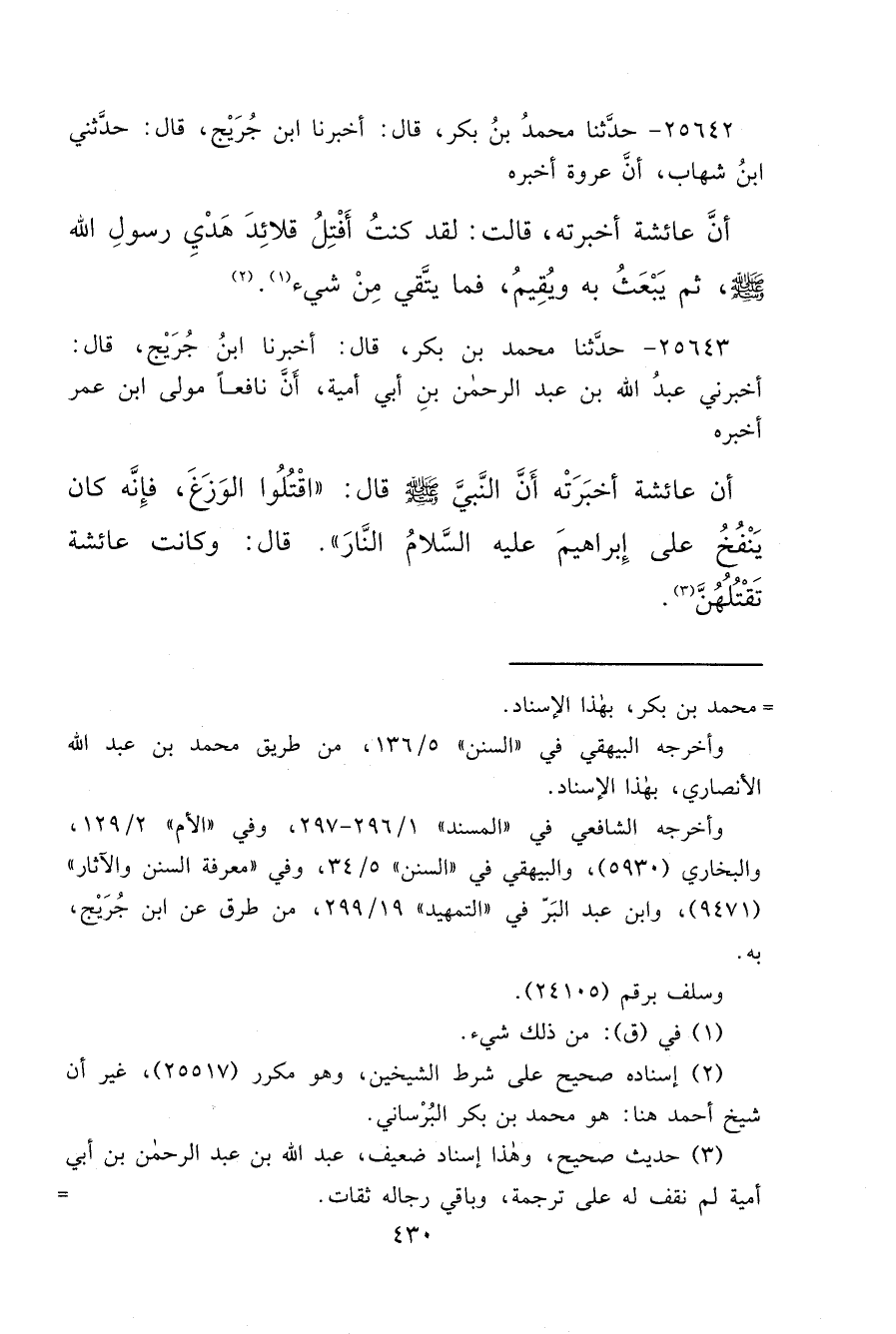 ٢٥٦٤٣ - حَدَّثَنَا مُحَمَّدُ بْنُ بَكْرٍ، قَالَ: أَخْبَرَنَا ابْنُ جُرَيْجٍ، قَالَ: أَخْبَرَنِي عَبْدُ اللهِ بْنُ عَبْدِ الرَّحْمَنِ بْنِ أَبِي أُمَيَّةَ، أَنَّ نَافِعًا، مَوْلَى ابْنِ عُمَرَ أَخْبَرَهُ أَنَّ عَائِشَةَ أَخْبَرَتْهُ أَنَّ النَّبِيَّ صَلَّى اللهُ عَلَيْهِ وَسَلَّمَ قَالَ: " اقْتُلُوا الْوَزَغَ، فَإِنَّهُ كَانَ يَنْفُخُ عَلَى إِبْرَاهِيمَ عَلَيْهِ السَّلَامُ النَّارَ " قَالَ وَكَانَتْ عَائِشَةُ تَقْتُلُهُنَّ (٣)