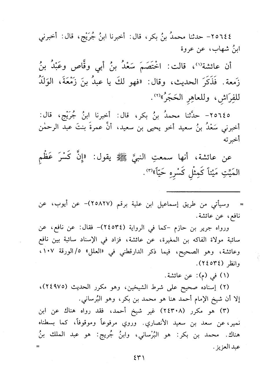٢٥٦٤٥ - حَدَّثَنَا مُحَمَّدُ بْنُ بَكْرٍ، قَالَ: أَخْبَرَنَا ابْنُ جُرَيْجٍ، قَالَ: أَخْبَرَنِي سَعْدُ بْنُ سَعِيدٍ، أَخُو يَحْيَى بْنِ سَعِيدٍ أَنَّ عَمْرَةَ بِنْتَ عَبْدِ الرَّحْمَنِ أَخْبَرَتْهُ، عَنْ عَائِشَةَ أَنَّهَا سَمِعَتِ النَّبِيَّ صَلَّى اللهُ عَلَيْهِ وَسَلَّمَ يَقُولُ: " إِنَّ كَسْرَ عَظْمِ الْمَيِّتِ مَيْتًا، كَمِثْلِ كَسْرِهِ حَيًّا " (٣)