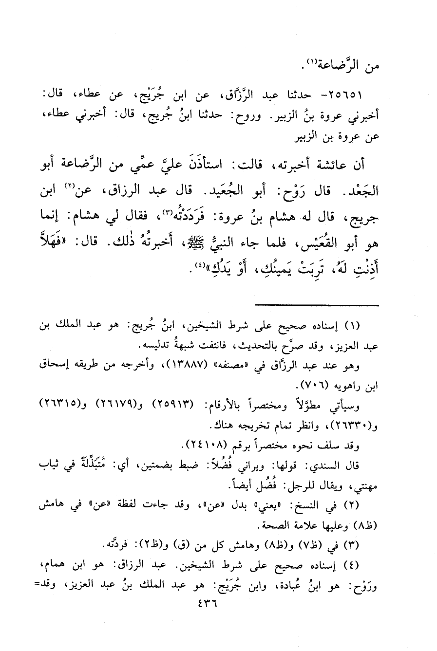 ٢٥٦٥١ - حَدَّثَنَا عَبْدُ الرَّزَّاقِ، عَنِ ابْنِ جُرَيْجٍ، عَنْ عَطَاءٍ، قَالَ: أَخْبَرَنِي عُرْوَةُ بْنُ الزُّبَيْرِ، وَرَوْحٌ، حَدَّثَنَا ابْنُ جُرَيْجٍ، قَالَ: أَخْبَرَنِي عَطَاءٌ، عَنْ عُرْوَةَ بْنِ الزُّبَيْرِ، أَنَّ عَائِشَةَ أَخْبَرَتْهُ، قَالَتْ: اسْتَأْذَنَ عَلَيَّ عَمِّي مِنَ الرَّضَاعَةِ أَبُو الْجَعْدِ، قَالَ رَوْحٌ أَبُو الْجُعَيْدِ، قَالَ عَبْدُ الرَّزَّاقِ عْنِ (٢) ابْنَ جُرَيْجٍ، قَالَ لَهُ هِشَامُ بْنُ عُرْوَةَ فَرَدَدْتُهُ، (٣) فَقَالَ لِي هِشَامٌ إِنَّمَا هُوَ أَبُو الْقُعَيْسِ فَلَمَّا جَاءَ النَّبِيُّ صَلَّى اللهُ عَلَيْهِ وَسَلَّمَ أَخْبَرْتُهُ ذَلِكَ قَالَ: " فَهَلَّا أَذِنْتِ لَهُ تَرِبَتْ يَمِينُكِ أَوْ يَدُكِ " (٤)