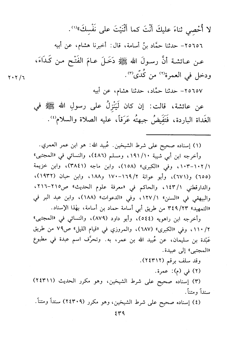 ٢٥٦٥٦ - حَدَّثَنَا حَمَّادُ بْنُ أُسَامَةَ، قَالَ: أَخْبَرَنَا هِشَامٌ، عَنْ أَبِيهِ عَنْ عَائِشَةَ، أَنَّ رَسُولَ اللهِ صَلَّى اللهُ عَلَيْهِ وَسَلَّمَ " دَخَلَ عَامَ الْفَتْحِ مِنْ كَدَاءَ، وَدَخَلَ فِي الْعُمْرَةِ (٢) مِنْ كُدًى " (٣)