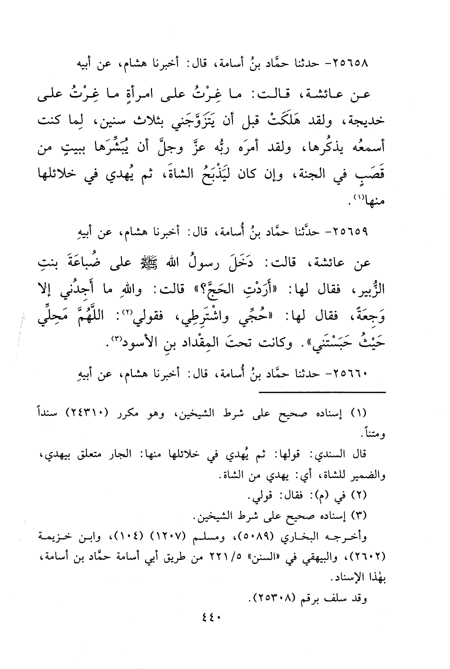 ٢٥٦٥٨ - حَدَّثَنَا حَمَّادُ بْنُ أُسَامَةَ، قَالَ: أَخْبَرَنَا هِشَامٌ، عَنْ أَبِيهِ، عَنْ عَائِشَةَ قَالَتْ: " مَا غِرْتُ عَلَى امْرَأَةٍ مَا غِرْتُ عَلَى خَدِيجَةَ، وَلَقَدْ هَلَكَتْ قَبْلَ أَنْ يَتَزَوَّجَنِي بِثَلَاثِ سِنِينَ، لِمَا كُنْتُ أَسْمَعُهُ يَذْكُرُهَا وَلَقَدْ أَمَرَهُ رَبُّهُ عَزَّ وَجَلَّ أَنْ يُبَشِّرَهَا بِبَيْتٍ مِنْ قَصَبٍ فِي الْجَنَّةِ، وَإِنْ كَانَ لَيَذْبَحُ الشَّاةَ، ثُمَّ يُهْدِي فِي خَلَائِلِهَا مِنْهَا " (١)