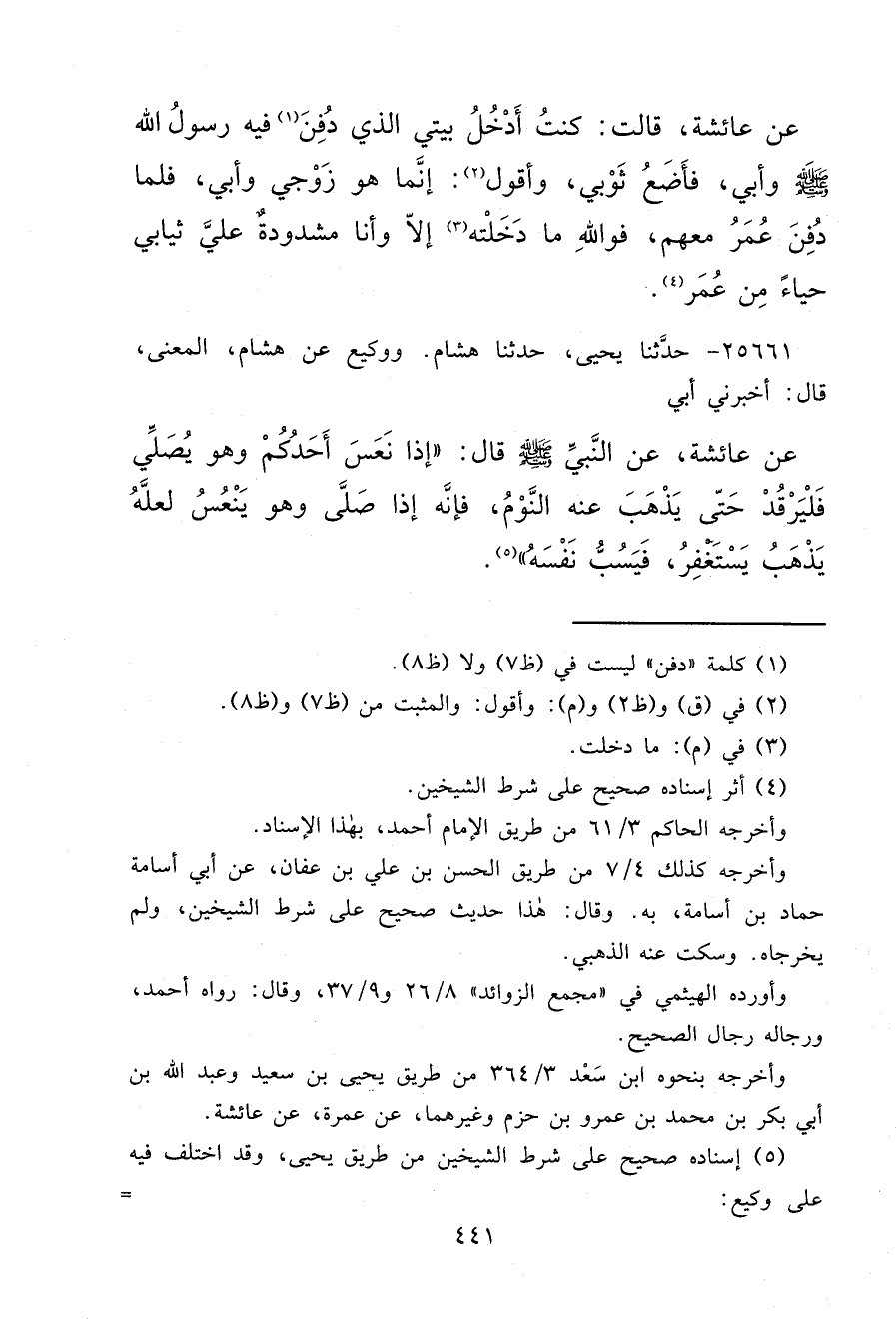 ٢٥٦٦١ - حَدَّثَنَا يَحْيَى، حَدَّثَنَا هِشَامٌ، وَوَكِيعٌ، عَنْ هِشَامٍ الْمَعْنَى، قَالَ: أَخْبَرَنِي أَبِي، عَنْ عَائِشَةَ، عَنِ النَّبِيِّ صَلَّى اللهُ عَلَيْهِ وَسَلَّمَ قَالَ: " إِذَا نَعَسَ أَحَدُكُمْ وَهُوَ يُصَلِّي، فَلْيَرْقُدْ حَتَّى يَذْهَبَ عَنْهُ النَّوْمُ، فَإِنَّهُ إِذَا صَلَّى وَهُوَ يَنْعَسُ، لَعَلَّهُ يَذْهَبُ يَسْتَغْفِرُ فَيَسُبُّ نَفْسَهُ " (٥)