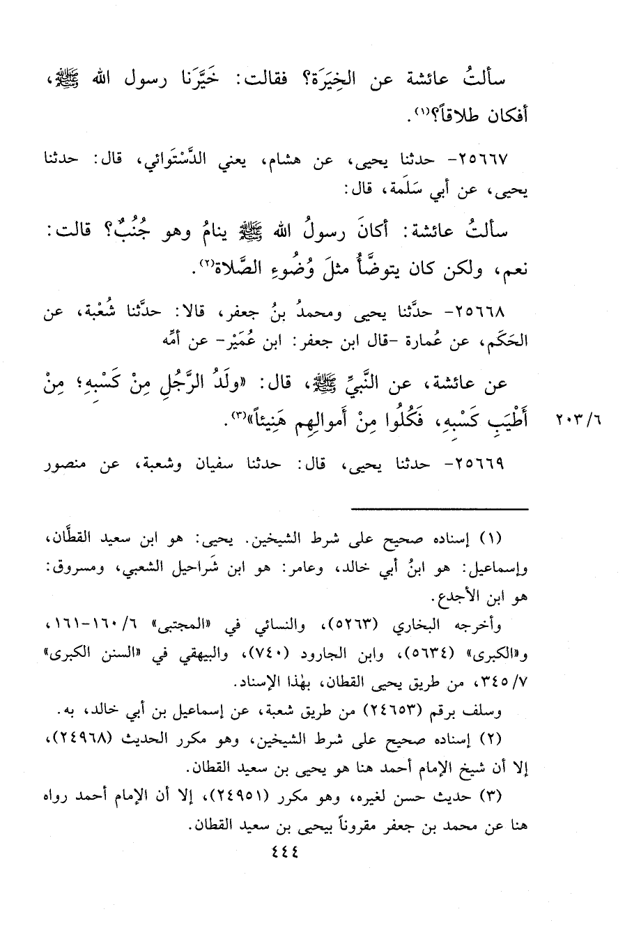 ٢٥٦٦٨ - حَدَّثَنَا يَحْيَى، وَمُحَمَّدُ بْنُ جَعْفَرٍ، قَالَا حَدَّثَنَا شُعْبَةُ، عَنِ الْحَكَمِ، عَنْ عُمَارَةَ - قَالَ ابْنُ جَعْفَرٍ ابْنُ عُمَيْرٍ - عَنْ أُمِّهِ، عَنْ عَائِشَةَ، عَنِ النَّبِيِّ صَلَّى اللهُ عَلَيْهِ وَسَلَّمَ قَالَ: " وَلَدُ الرَّجُلِ مِنْ كَسْبِهِ، مِنْ أَطْيَبِ كَسْبِهِ، فَكُلُوا مِنْ أَمْوَالِهِمْ هَنِيئًا " (٣)