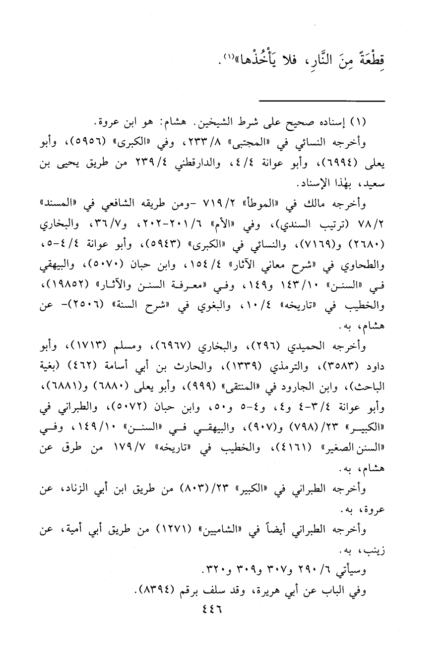 وأخرجه مالك في "الموطأ" ٢/٧١٩ -ومن طريقه الشافعي في "المسند" ٢/٧٨ (ترتيب السندي) ، وفي "الأم" ٦/٢٠١-٢٠٢، و٧/٣٦، والبخاري (٢٦٨٠) و (٧١٦٩) ، والنسائي في "الكبرى" (٥٩٤٣) ، وأبو عوانة ٤/٤-٥، والطحاوي في "شرح معاني الآثار" ٤/١٥٤، وابن حبان (٥٠٧٠) ، والبيهقي في "السنن" ١٠/١٤٣ و١٤٩، وفي "معرفة السنن والآثار" (١٩٨٥٢) ، والخطيب في "تاريخه" ٤/١٠، والبغوي في "شرح السنة" (٢٥٠٦) - عن هشام، به.