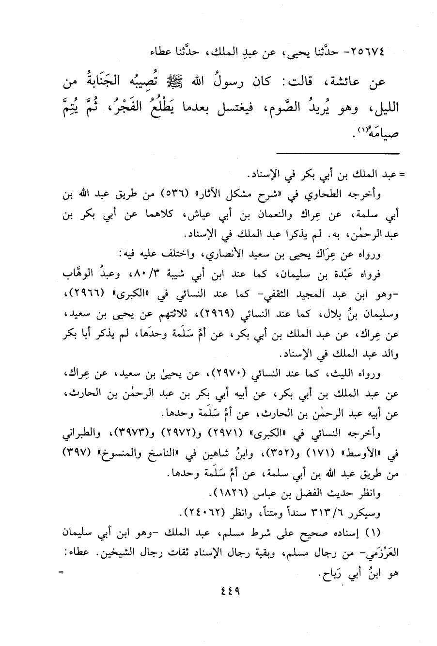 ٢٥٦٧٤ - حَدَّثَنَا يَحْيَى، عَنْ عَبْدِ الْمَلِكِ، حَدَّثَنَا عَطَاءٌ، عَنْ عَائِشَةَ، قَالَتْ: كَانَ رَسُولُ اللهِ صَلَّى اللهُ عَلَيْهِ وَسَلَّمَ " تُصِيبُهُ الْجَنَابَةُ مِنَ اللَّيْلِ، وَهُوَ يُرِيدُ الصَّوْمَ، فَيَغْتَسِلُ بَعْدَمَا يَطْلُعُ الْفَجْرُ، ثُمَّ يُتِمُّ صِيَامَهُ " (١)