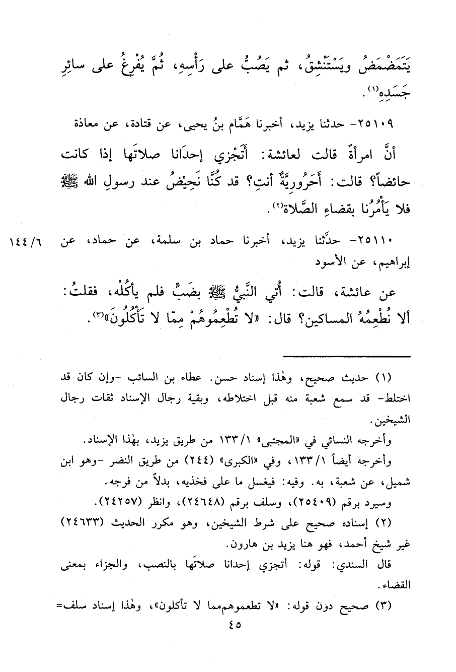 ٢٥١٠٩ - حَدَّثَنَا يَزِيدُ، أَخْبَرَنَا هَمَّامُ بْنُ يَحْيَى، عَنْ قَتَادَةَ، عَنْ مُعَاذَةَ، أَنَّ امْرَأَةً قَالَتْ لِعَائِشَةَ: أَتَجْزِي إِحْدَانَا صَلَاتَهَا إِذَا كَانَتْ حَائِضًا؟ قَالَتْ: " أَحَرُورِيَّةٌ أَنْتِ؟ قَدْ كُنَّا نَحِيضُ عِنْدَ رَسُولِ اللهِ صَلَّى اللهُ عَلَيْهِ وَسَلَّمَ فَلَا يَأْمُرُنَا بِقَضَاءِ الصَّلَاةِ " (٢)