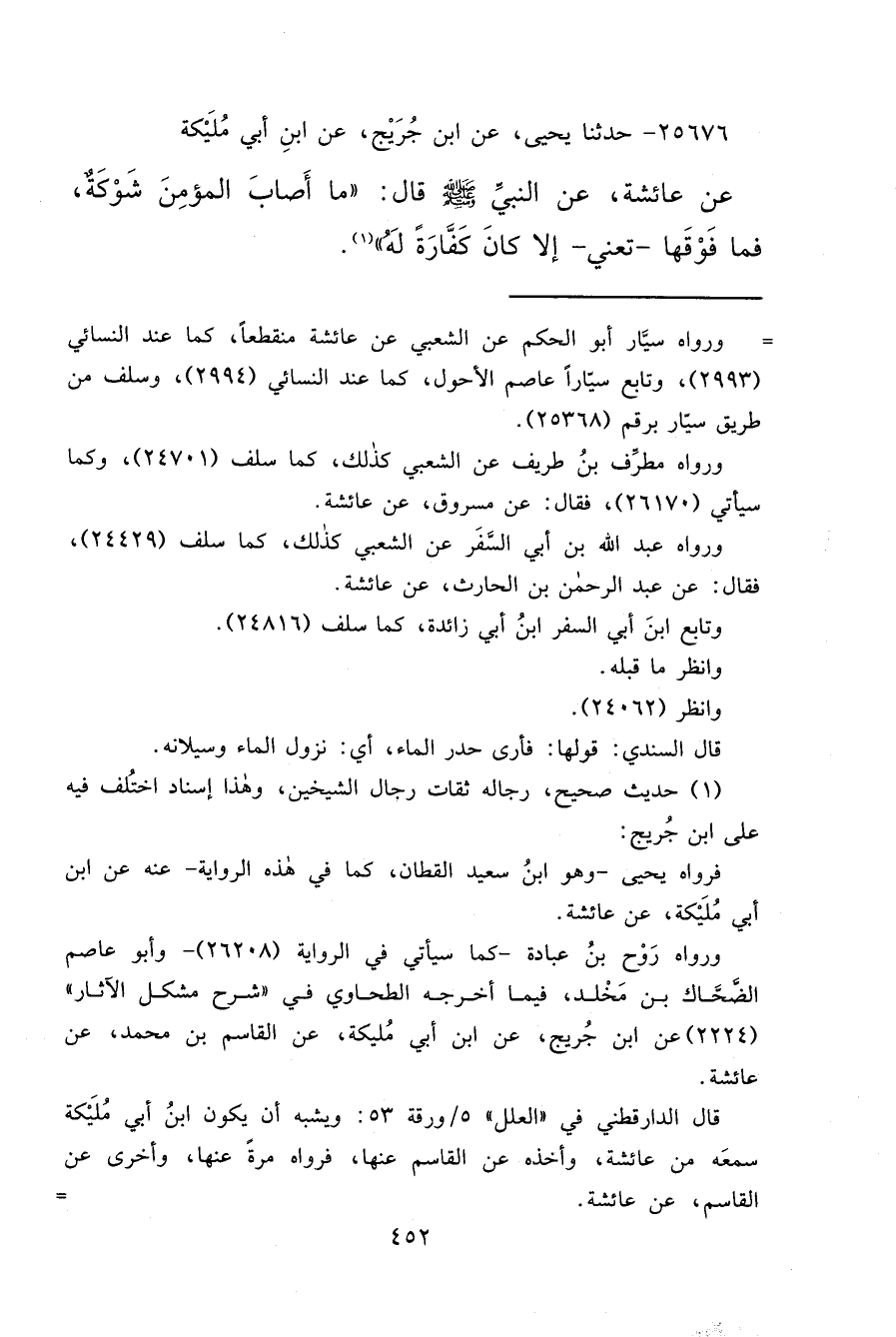 ٢٥٦٧٦ - حَدَّثَنَا يَحْيَى، عَنِ ابْنِ جُرَيْجٍ، عَنِ ابْنِ أَبِي مُلَيْكَةَ، عَنْ عَائِشَةَ، عَنِ النَّبِيِّ صَلَّى اللهُ عَلَيْهِ وَسَلَّمَ قَالَ: " مَا أَصَابَ الْمُؤْمِنَ شَوْكَةٌ، فَمَا فَوْقَهَا، تَعْنِي، إِلَّا كَانَ كَفَّارَةً لَهُ " (١)