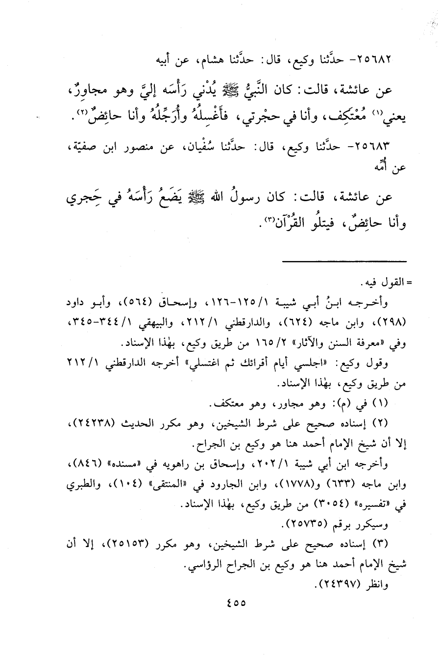 ٢٥٦٨٢ - حَدَّثَنَا وَكِيعٌ قَالَ: حَدَّثَنَا هِشَامٌ، عَنْ أَبِيهِ، عَنْ عَائِشَةَ قَالَتْ: " كَانَ النَّبِيُّ صَلَّى اللهُ عَلَيْهِ وَسَلَّمَ يُدْنِي رَأْسَهُ إِلَيَّ، وَهُوَ مُجَاوِرٌ، يَعْنِي (١) مُعْتَكِف وَأَنَا فِي حُجْرَتِي، فَأَغْسِلُهُ وَأُرَجِّلُهُ، وَأَنَا حَائِضٌ " (٢)