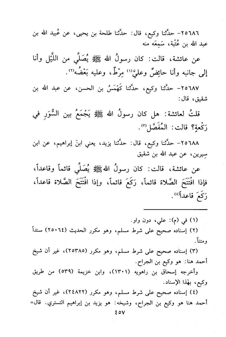 ٢٥٦٨٨ - حَدَّثَنَا وَكِيعٌ قَالَ: حَدَّثَنَا يَزِيدُ يَعْنِي ابْنَ إِبْرَاهِيمَ، عَنِ ابْنِ سِيرِينَ، عَنْ عَبْدِ اللهِ بْنِ شَقِيقٍ، عَنْ عَائِشَةَ قَالَتْ: كَانَ رَسُولُ اللهِ صَلَّى اللهُ عَلَيْهِ وَسَلَّمَ " يُصَلِّي قَائِمًا وَقَاعِدًا، فَإِذَا افْتَتَحَ الصَّلَاةَ قَائِمًا، رَكَعَ قَائِمًا، وَإِذَا افْتَتَحَ الصَّلَاةَ قَاعِدًا رَكَعَ قَاعِدًا " (٤)