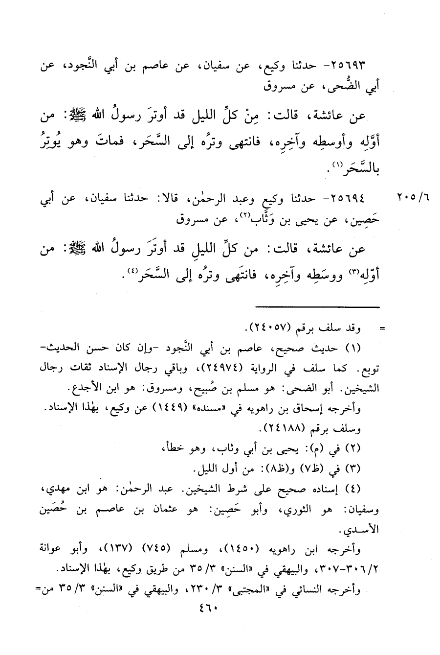 ٢٥٦٩٣ - حَدَّثَنَا وَكِيعٌ، عَنْ سُفْيَانَ، عَنْ عَاصِمِ بْنِ أَبِي النَّجُودِ، عَنْ أَبِي الضُّحَى، عَنْ مَسْرُوقٍ، عَنْ عَائِشَةَ، قَالَتْ: " مِنْ كُلِّ اللَّيْلِ قَدْ أَوْتَرَ رَسُولُ اللهِ صَلَّى اللهُ عَلَيْهِ وَسَلَّمَ، مِنْ أَوَّلِهِ، وَأَوْسَطِهِ، وَآخِرِهِ، فَانْتَهَى وَتْرُهُ إِلَى السَّحَرِ، فَمَاتَ وَهُوَ يُوتِرُ بِالسَّحَرِ " (١)