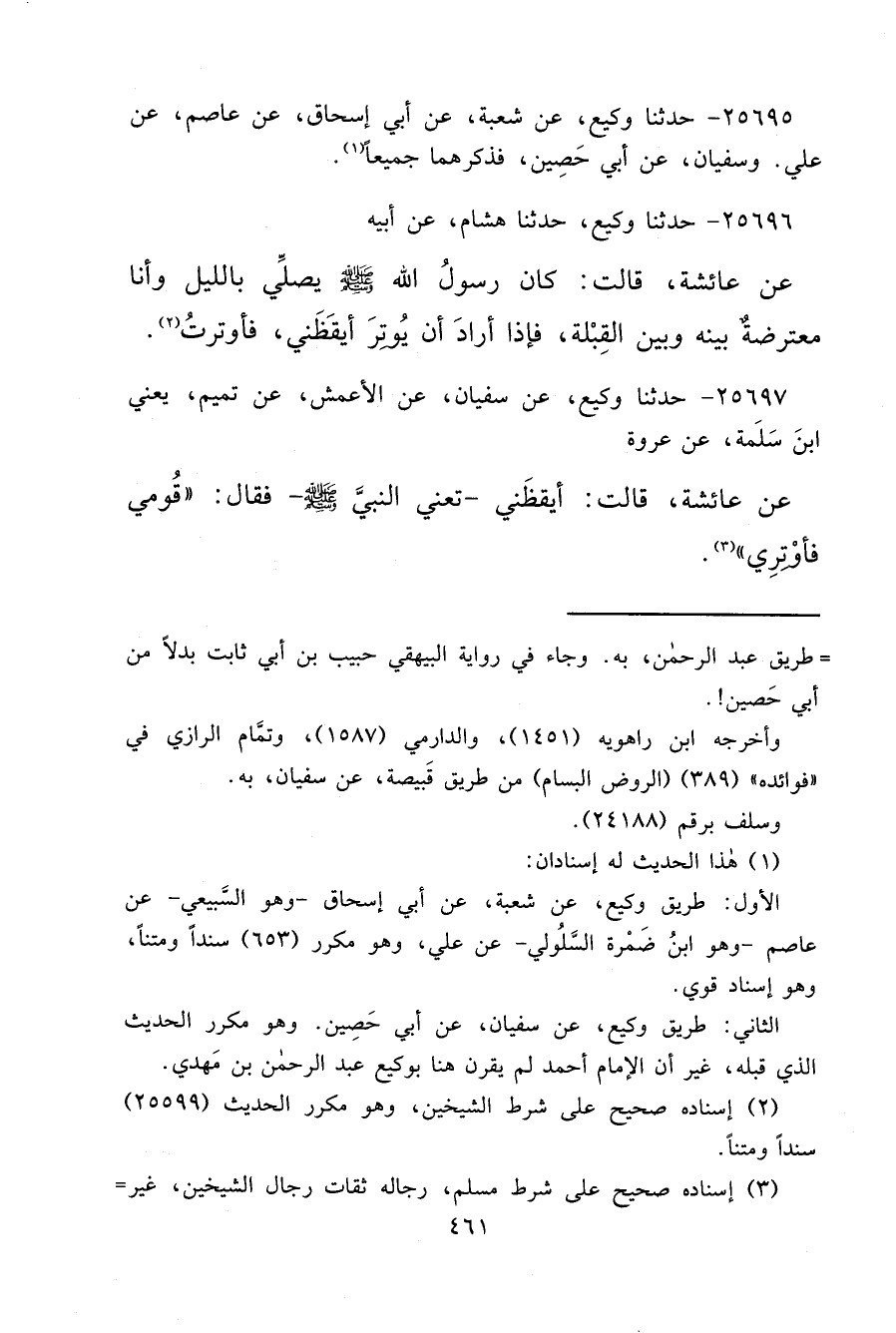 ٢٥٦٩٦ - حَدَّثَنَا وَكِيعٌ، حَدَّثَنَا هِشَامٌ، عَنْ أَبِيهِ، عَنْ عَائِشَةَ، قَالَتْ: " كَانَ رَسُولُ اللهِ صَلَّى اللهُ عَلَيْهِ وَسَلَّمَ يُصَلِّي بِاللَّيْلِ وَأَنَا مُعْتَرِضَةٌ بَيْنَهُ وَبَيْنَ الْقِبْلَةِ فَإِذَا أَرَادَ أَنْ يُوتِرَ أَيْقَظَنِي فَأَوْتَرْتُ " (٢)