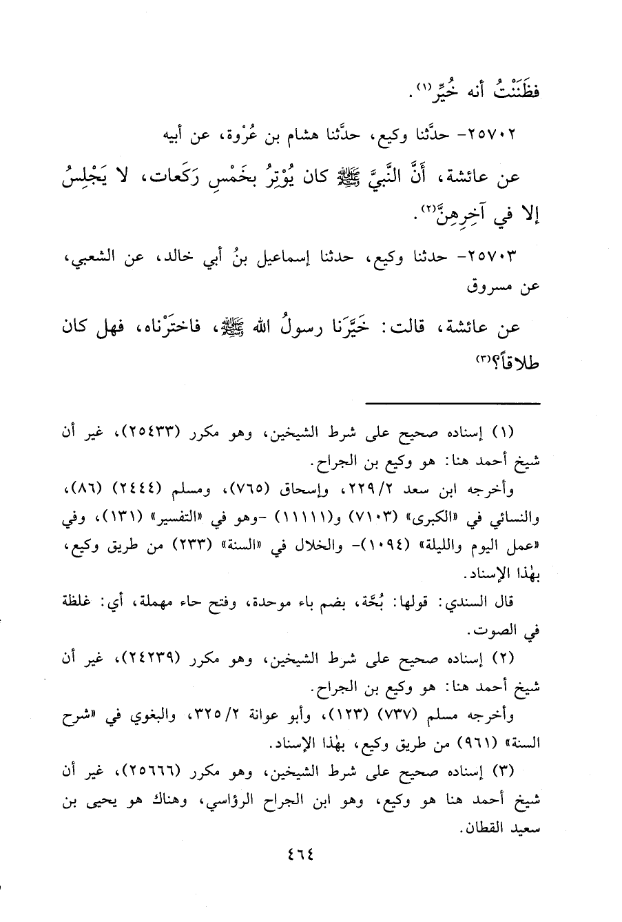 ٢٥٧٠٢ - حَدَّثَنَا وَكِيعٌ، حَدَّثَنَا هِشَامُ بْنُ عُرْوَةَ، عَنْ أَبِيهِ، عَنْ عَائِشَةَ أَنَّ النَّبِيَّ صَلَّى اللهُ عَلَيْهِ وَسَلَّمَ كَانَ " يُوتِرُ بِخَمْسِ رَكَعَاتٍ، لَا يَجْلِسُ إِلَّا فِي آخِرِهِنَّ " (٢)