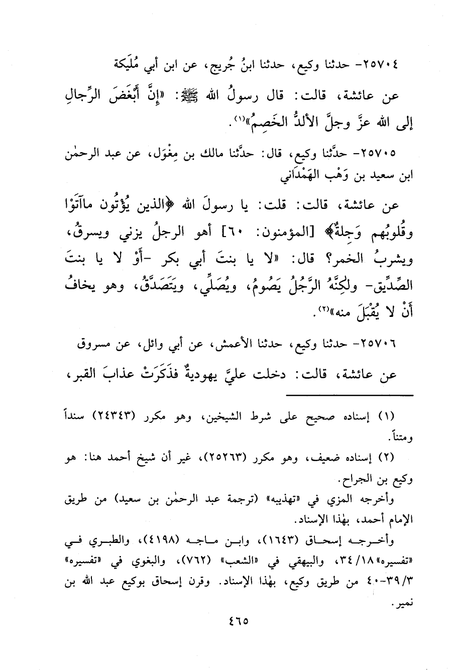 ٢٥٧٠٤ - حَدَّثَنَا وَكِيعٌ، حَدَّثَنَا ابْنُ جُرَيْجٍ، عَنِ ابْنِ أَبِي مُلَيْكَةَ، عَنْ عَائِشَةَ قَالَتْ: قَالَ رَسُولُ اللهِ صَلَّى اللهُ عَلَيْهِ وَسَلَّمَ:: إِنَّ أَبْغَضَ الرِّجَالِ إِلَى اللهِ عَزَّ وَجَلَّ، الْأَلَدُّ الْخَصِمُ " (١)