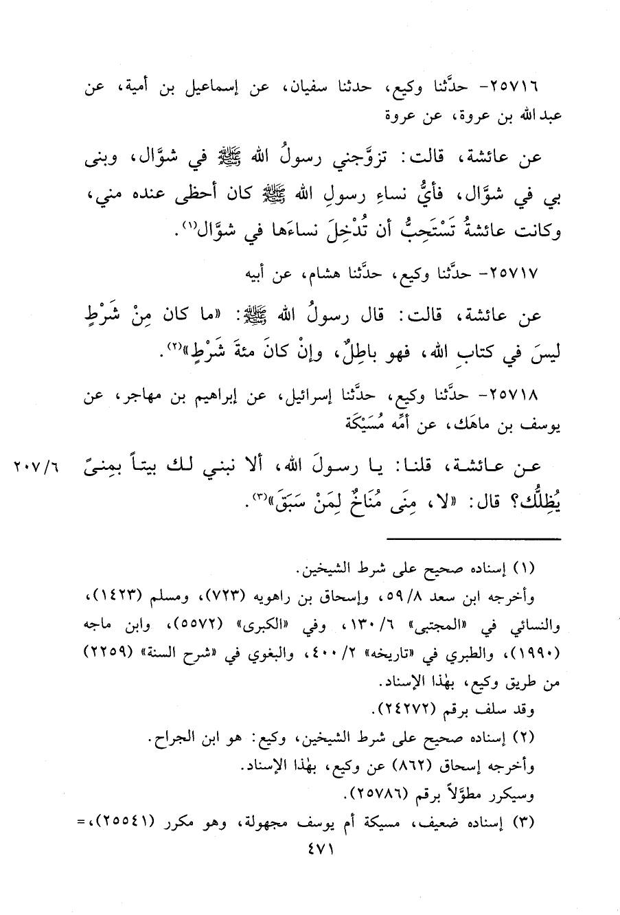 ٢٥٧١٦ - حَدَّثَنَا وَكِيعٌ، حَدَّثَنَا سُفْيَانُ، عَنْ إِسْمَاعِيلَ بْنِ أُمَيَّةَ، عَنْ عَبْدِ اللهِ بْنِ عُرْوَةَ، عَنْ عُرْوَةَ، عَنْ عَائِشَةَ قَالَتْ: " تَزَوَّجَنِي رَسُولُ اللهِ صَلَّى اللهُ عَلَيْهِ وَسَلَّمَ فِي شَوَّالٍ، وَبَنَى بِي فِي شَوَّالٍ، فَأَيُّ نِسَاءِ رَسُولِ اللهِ صَلَّى اللهُ عَلَيْهِ وَسَلَّمَ كَانَ أَحْظَى عِنْدَهُ مِنِّي؟ " وَكَانَتْ عَائِشَةُ تَسْتَحِبُّ أَنْ تُدْخِلَ نِسَاءَهَا فِي شَوَّالٍ (١)