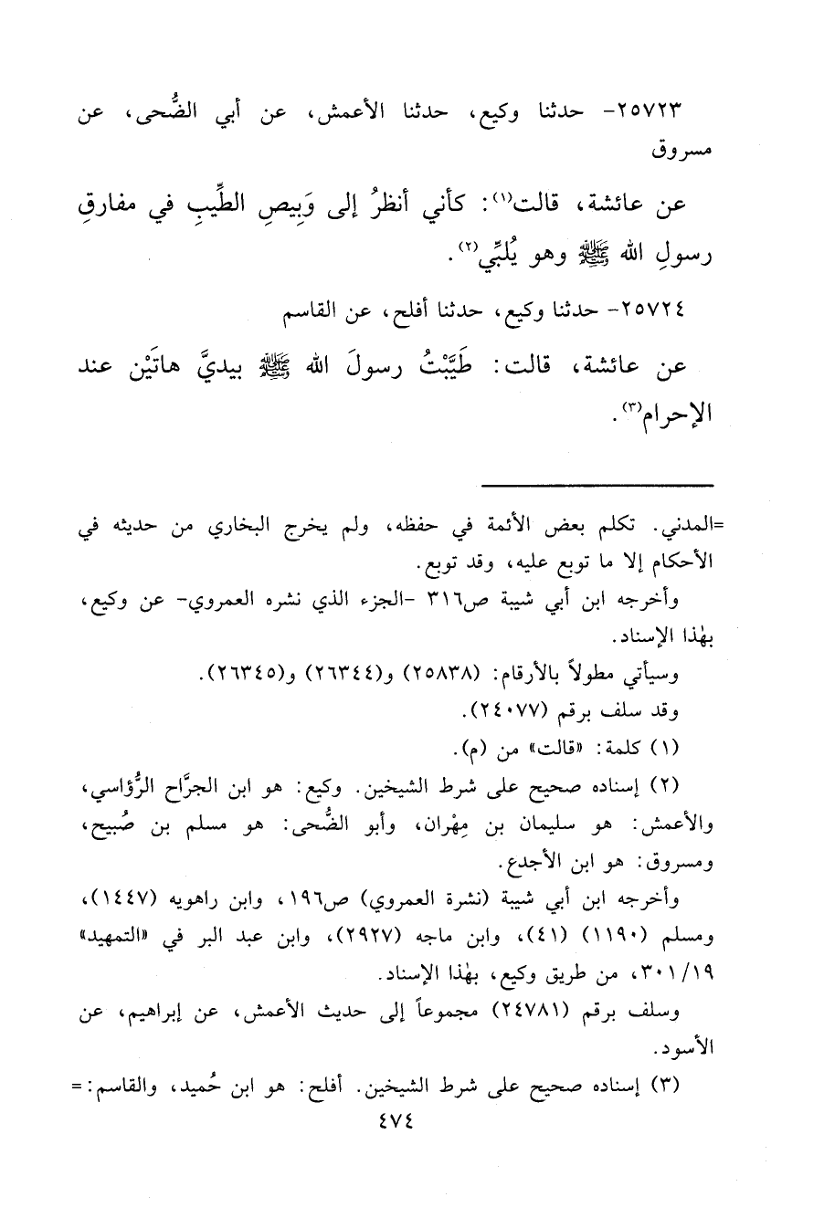 ٢٥٧٢٣ - حَدَّثَنَا وَكِيعٌ، حَدَّثَنَا الْأَعْمَشُ، عَنْ أَبِي الضُّحَى، عَنْ مَسْرُوقٍ، عَنْ عَائِشَةَ قَالَتْ (١) : " كَأَنِّي أَنْظُرُ إِلَى وَبِيصِ الطِّيبِ فِي مَفَارِقِ رَسُولِ اللهِ صَلَّى اللهُ عَلَيْهِ وَسَلَّمَ وَهُوَ يُلَبِّي " (٢)