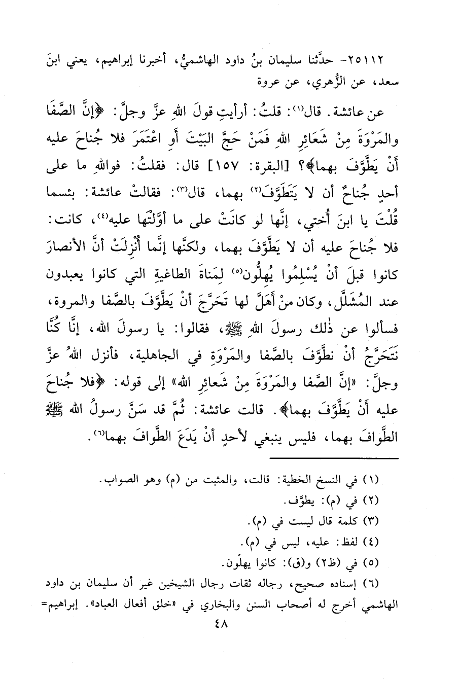 ٢٥١١٢ - حَدَّثَنَا سُلَيْمَانُ بْنُ دَوُادَ الْهَاشِمِيُّ، أَخْبَرَنَا إِبْرَاهِيمُ يَعْنِي ابْنَ سَعْدٍ، عَنِ الزُّهْرِيِّ، عَنْ عُرْوَةَ، عَنْ عَائِشَةَ، قَالَ: (١) قُلْتُ: أَرَأَيْتِ قَوْلَ اللهِ عَزَّ وَجَلَّ: {إِنَّ الصَّفَا وَالْمَرْوَةَ مِنْ شَعَائِرِ اللهِ فَمَنْ حَجَّ الْبَيْتَ أَوْ اعْتَمَرَ فَلَا جُنَاحَ عَلَيْهِ أَنْ يَطَّوَّفَ بِهِمَا} [البقرة: ١٥٨] قَالَ: فَقُلْتُ: فَوَاللهِ مَا عَلَى أَحَدٍ جُنَاحٌ أَنْ لَا يَتَطَوَّفَ (٢) بِهِمَا، قَالَ: (٣) فَقَالَتْ عَائِشَةُ: " بِئْسَمَا قُلْتَ يَا ابْنَ أُخْتِي، إِنَّهَا لَوْ كَانَتْ عَلَى مَا أَوَّلْتَهَا عَلَيْهِ، (٤) كَانَتْ: فَلَا جُنَاحَ عَلَيْهِ أَنْ لَا يَطَّوَّفَ بِهِمَا، وَلَكِنَّهَا إِنَّمَا أُنْزِلَتْ أَنَّ الْأَنْصَارَ كَانُوا قَبْلَ أَنْ يُسْلِمُوا يُهِلُّونَ (٥) لِمَنَاةَ الطَّاغِيَةِ الَّتِي كَانُوا يَعْبُدُونَ عِنْدَ الْمُشَلَّلِ، وَكَانَ مَنْ أَهَلَّ لَهَا تَحَرَّجَ أَنْ يَطَّوَّفَ بِالصَّفَا وَالْمَرْوَةِ، فَسَأَلُوا عَنْ ذَلِكَ رَسُولَ اللهِ صَلَّى اللهُ عَلَيْهِ وَسَلَّمَ فَقَالُوا: يَا رَسُولَ اللهِ، إِنَّا كُنَّا نَتَحَرَّجُ أَنْ نَطَّوَّفَ بِالصَّفَا وَالْمَرْوَةِ فِي الْجَاهِلِيَّةِ، فَأَنْزَلَ اللهُ عَزَّ وَجَلَّ: {إِنَّ الصَّفَا وَالْمَرْوَةَ مِنْ شَعَائِرِ اللهِ} [البقرة: ١٥٨] ، إِلَى قَوْلِهِ، {فَلَا جُنَاحَ عَلَيْهِ أَنْ يَطَّوَّفَ بِهِمَا} [البقرة: ١٥٨] " قَالَتْ عَائِشَةُ: " ثُمَّ قَدْ سَنَّ رَسُولُ اللهِ صَلَّى اللهُ عَلَيْهِ وَسَلَّمَ الطَّوَافَ بِهِمَا، فَلَيْسَ يَنْبَغِي لِأَحَدٍ أَنْ يَدَعَ الطَّوَافَ بِهِمَا " (٦)