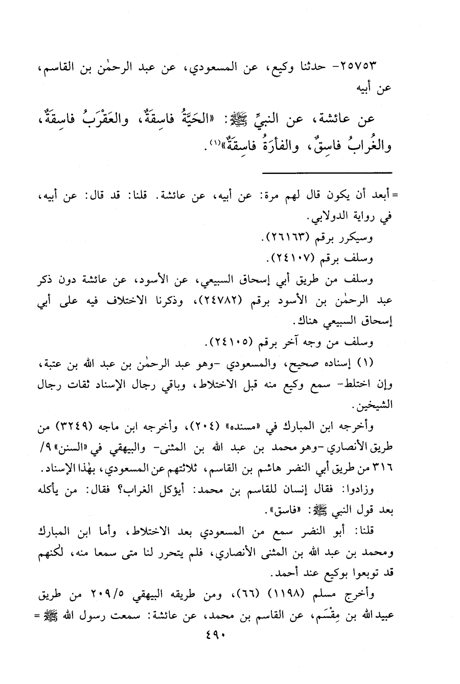 ٢٥٧٥٣ - حَدَّثَنَا وَكِيعٌ، عَنِ الْمَسْعُودِيِّ، عَنْ عَبْدِ الرَّحْمَنِ بْنِ الْقَاسِمِ، عَنْ أَبِيهِ، عَنْ عَائِشَةَ، عَنِ النَّبِيِّ صَلَّى اللهُ عَلَيْهِ وَسَلَّمَ: " الْحَيَّةُ فَاسِقَةٌ، وَالْعَقْرَبُ فَاسِقَةٌ، وَالْغُرَابُ فَاسِقٌ، وَالْفَأْرَةُ فَاسِقَةٌ " (١)