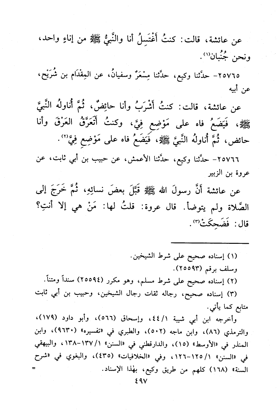 ٢٥٧٦٥ - حَدَّثَنَا وَكِيعٌ، حَدَّثَنَا مِسْعَرٌ، وَسُفْيَانُ، عَنِ الْمِقْدَامِ بْنِ شُرَيْحٍ، عَنْ أَبِيهِ، عَنْ عَائِشَةَ قَالَتْ: " كُنْتُ أَشْرَبُ وَأَنَا حَائِضٌ، ثُمَّ أُنَاوِلُهُ النَّبِيَّ صَلَّى اللهُ عَلَيْهِ وَسَلَّمَ، فَيَضَعُ فَاهُ عَلَى مَوْضِعِ فِيَّ، وَكُنْتُ أَتَعَرَّقُ الْعَرَقَ وَأَنَا حَائِضٌ، ثُمَّ أُنَاوِلُهُ النَّبِيَّ صَلَّى اللهُ عَلَيْهِ وَسَلَّمَ فَيَضَعُ فَاهُ عَلَى مَوْضِعِ فِيَّ " (٢)
