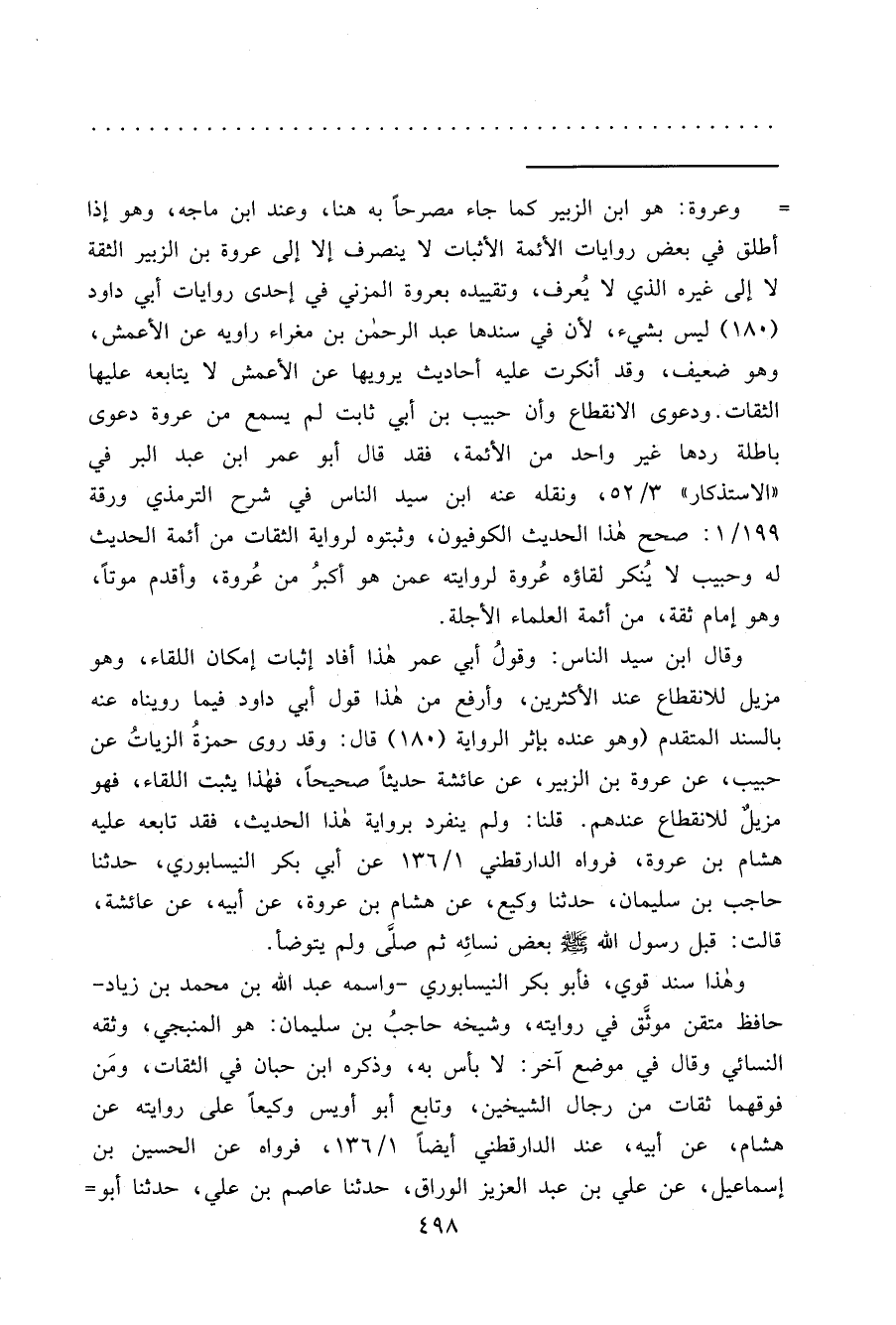 = وعروة: هو ابن الزبير كما جاء مصرحاً به هنا، وعند ابن ماجه، وهو إذا أطلق في بعض روايات الأئمة الأثبات لا ينصرف إلا إلى عروة بن الزبير الثقة لا إلى غيره الذي لا يُعرف، وتقييده بعروة المزني في إحدى روايات أبي داود (١٨٠) ليس بشيء، لأن في سندها عبد الرحمن بن مغراء راويه عن الأعمش، وهو ضعيف، وقد أنكرت عليه أحاديث يرويها عن الأعمش لا يتابعه عليها الثقات. ودعوى الانقطاع وأن حبيب بن أبي ثابت لم يسمع من عروة دعوى باطلة ردها غير واحد من الأئمة، فقد قال أبو عمر ابن عبد البر في "الاستذكار" ٣/٥٢، ونقله عنه ابن سيد الناس في شرح الترمذي ورقة ١٩٩/١: صحح هذا الحديث الكوفيون، وثبتوه لرواية الثقات من أئمة الحديث