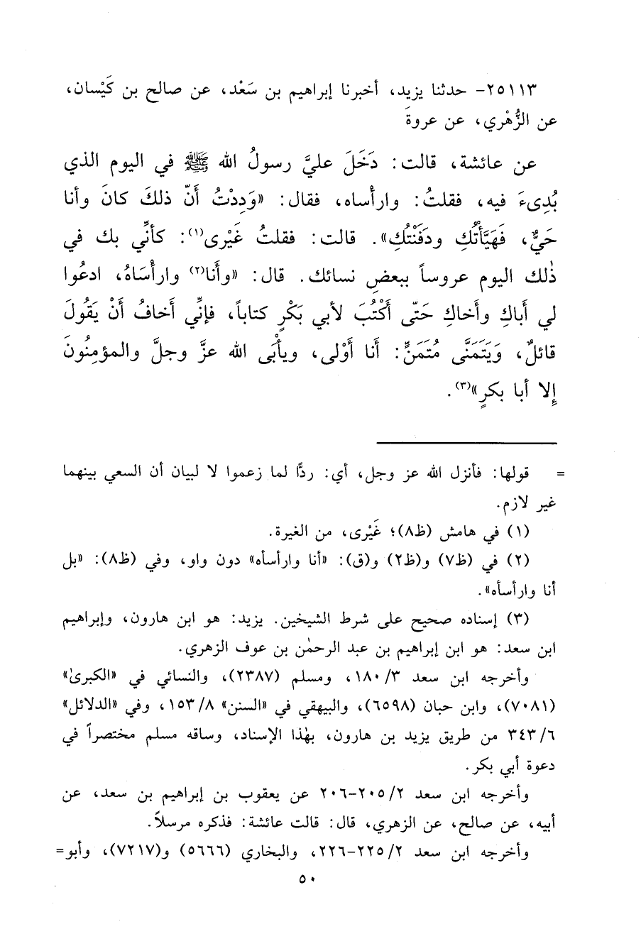 ٢٥١١٣ - حَدَّثَنَا يَزِيدُ، أَخْبَرَنَا إِبْرَاهِيمُ بْنُ سَعْدٍ، عَنْ صَالِحِ بْنِ كَيْسَانَ، عَنِ الزُّهْرِيِّ، عَنْ عُرْوَةَ، عَنْ عَائِشَةَ، قَالَتْ: دَخَلَ عَلَيَّ رَسُولُ اللهِ صَلَّى اللهُ عَلَيْهِ وَسَلَّمَ فِي الْيَوْمِ الَّذِي بُدِئَ فِيهِ، فَقُلْتُ: وَارَأْسَاهْ، فَقَالَ: " وَدِدْتُ أَنَّ ذَلِكَ كَانَ وَأَنَا حَيٌّ، فَهَيَّأْتُكِ وَدَفَنْتُكِ " قَالَتْ: فَقُلْتُ غَيْرَى: (١) كَأَنِّي بِكَ فِي ذَلِكَ الْيَوْمِ عَرُوسًا بِبَعْضِ نِسَائِكَ. قَالَ: " وَأَنَا (٢) وَارَأْسَاهْ، ادْعُوا لِي أَبَاكِ وَأَخَاكِ حَتَّى أَكْتُبَ لِأَبِي بَكْرٍ كِتَابًا، فَإِنِّي أَخَافُ أَنْ يَقُولَ قَائِلٌ، وَيَتَمَنَّى مُتَمَنٍّ: أَنَا أَوْلَى، وَيَأْبَى الله عَزَّ وَجَلَّ وَالْمُؤْمِنُونَ إِلَّا أَبَا بَكْرٍ " (٣)