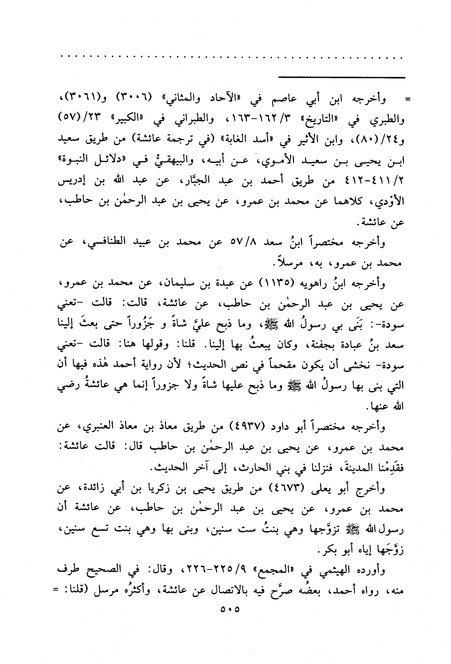 وأخرجه ابنُ راهويه (١١٣٥) عن عبدة بن سليمان، عن محمد بن عمرو، عن يحيى بن عبد الرحمن بن حاطب، عن عائشة، قالت: قالت -تعني سودة-: بَنَى بي رسولُ الله صَلَّى اللهُ عَلَيْهِ وَسَلَّمَ، وما ذبح علي شاةً وجَزُوراً حتى بعثَ إلينا سعد بنُ عبادة بجفنة، وكان يبعثُ بها إلينا. قلنا: وقولها هنا: قالت -تعني سودة- نخشى أن يكون مقحماً في نص الحديث؛ لأن رواية أحمد هذه فيها أن التي بنى بها رسولُ الله صَلَّى اللهُ عَلَيْهِ وَسَلَّمَ وما ذبح عليها شاةً ولا جزوراً إنما هي عائشةُ رضي الله عنها.