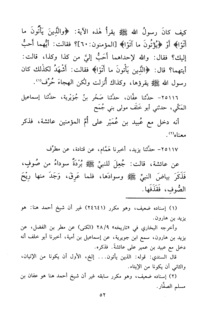 ٢٥١١٦ - حَدَّثَنَا عَفَّانُ، حَدَّثَنَا صَخْرُ بْنُ جُوَيْرِيَةَ، حَدَّثَنَا إِسْمَاعِيلُ الْمَكِّيُّ، حَدَّثَنِي أَبُو خَلَفٍ، مَوْلَى بَنِي جُمَحٍ أَنَّهُ دَخَلَ مَعَ عُبَيْدِ بْنِ عُمَيْرٍ عَلَى أُمِّ الْمُؤْمِنِينَ عَائِشَةَ، فَذَكَرَ مَعْنَاهُ (٢)